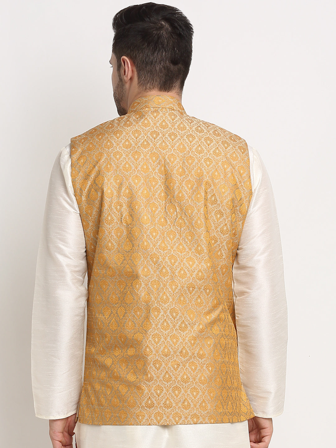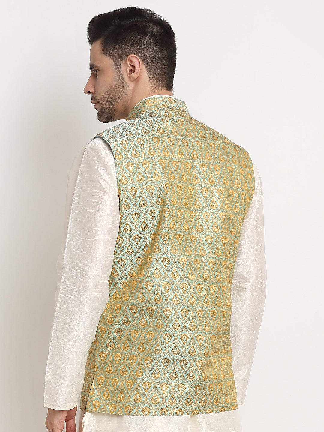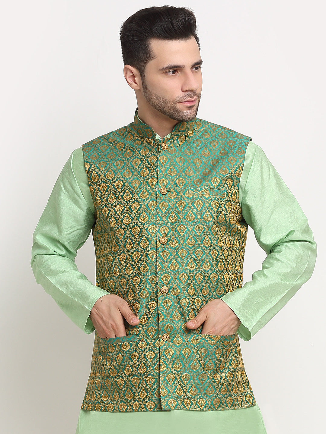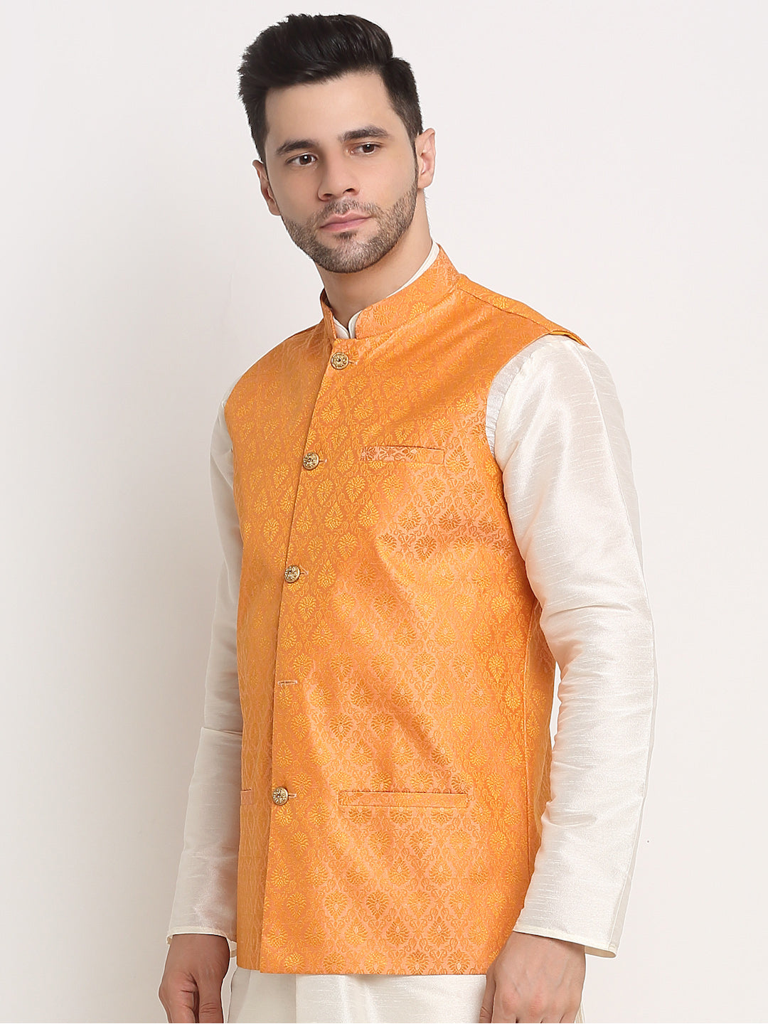 Woven Design Nehru jacket, has a mandarin collar, is sleeveless, button closure, three pockets, and an attached lining.