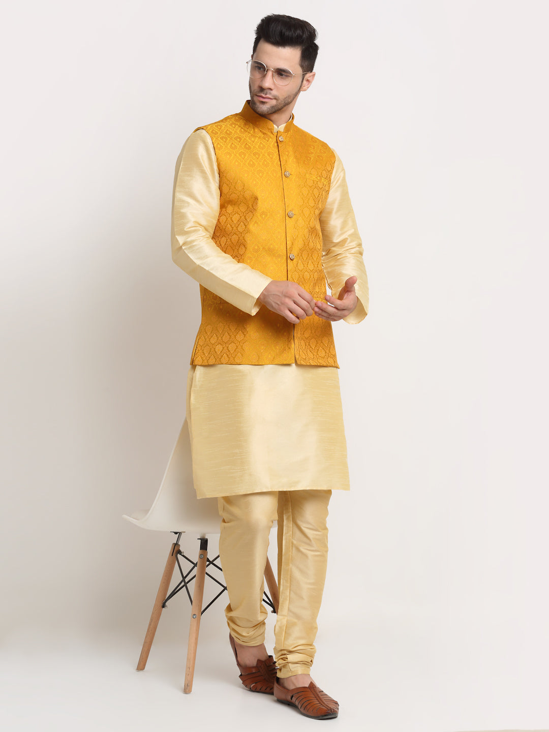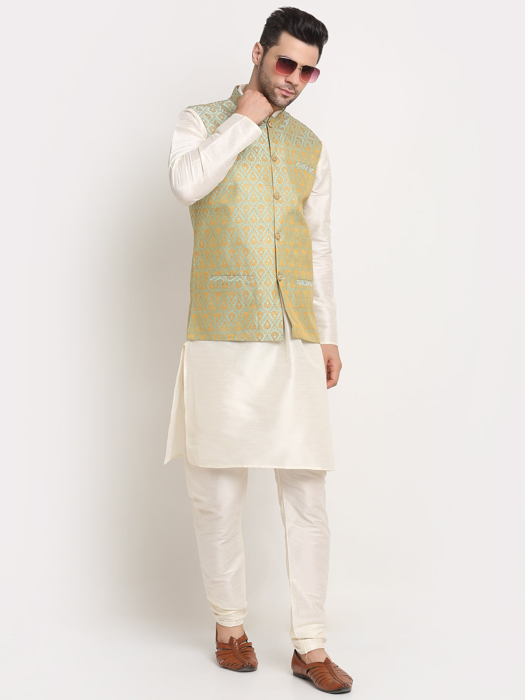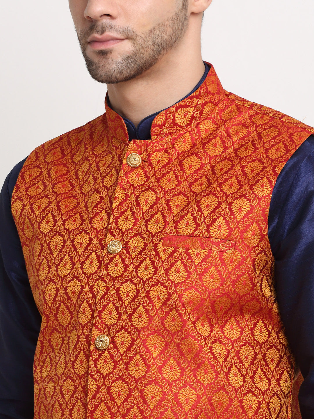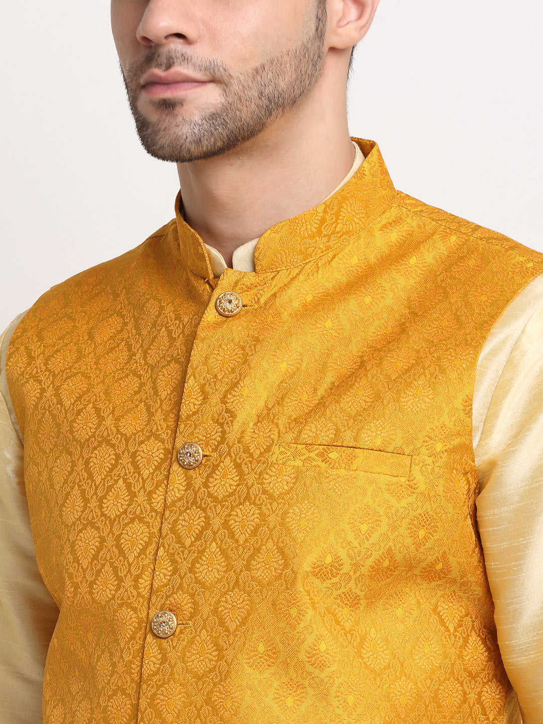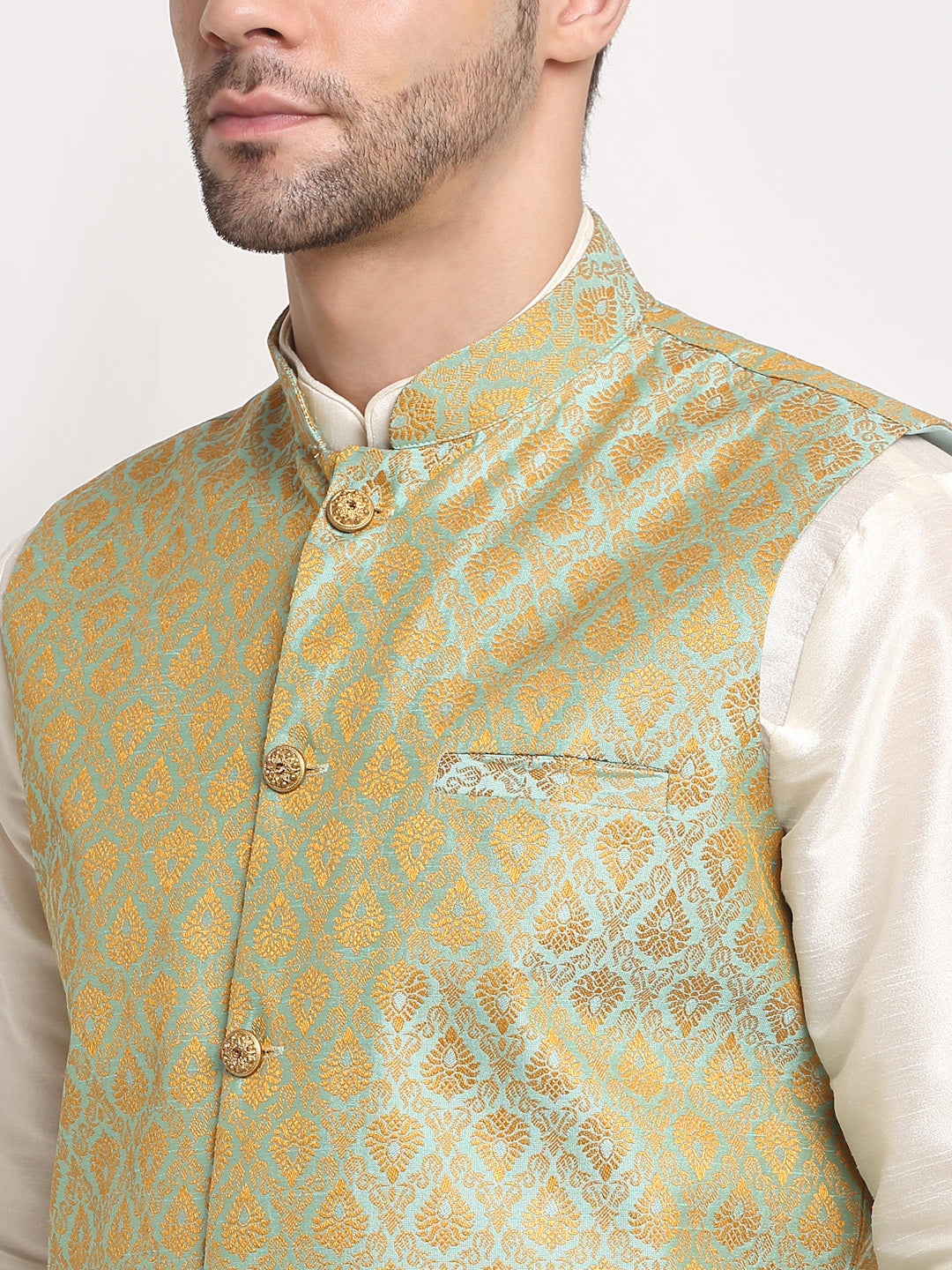 Woven Design Nehru jacket, has a mandarin collar, is sleeveless, button closure, three pockets, and an attached lining.