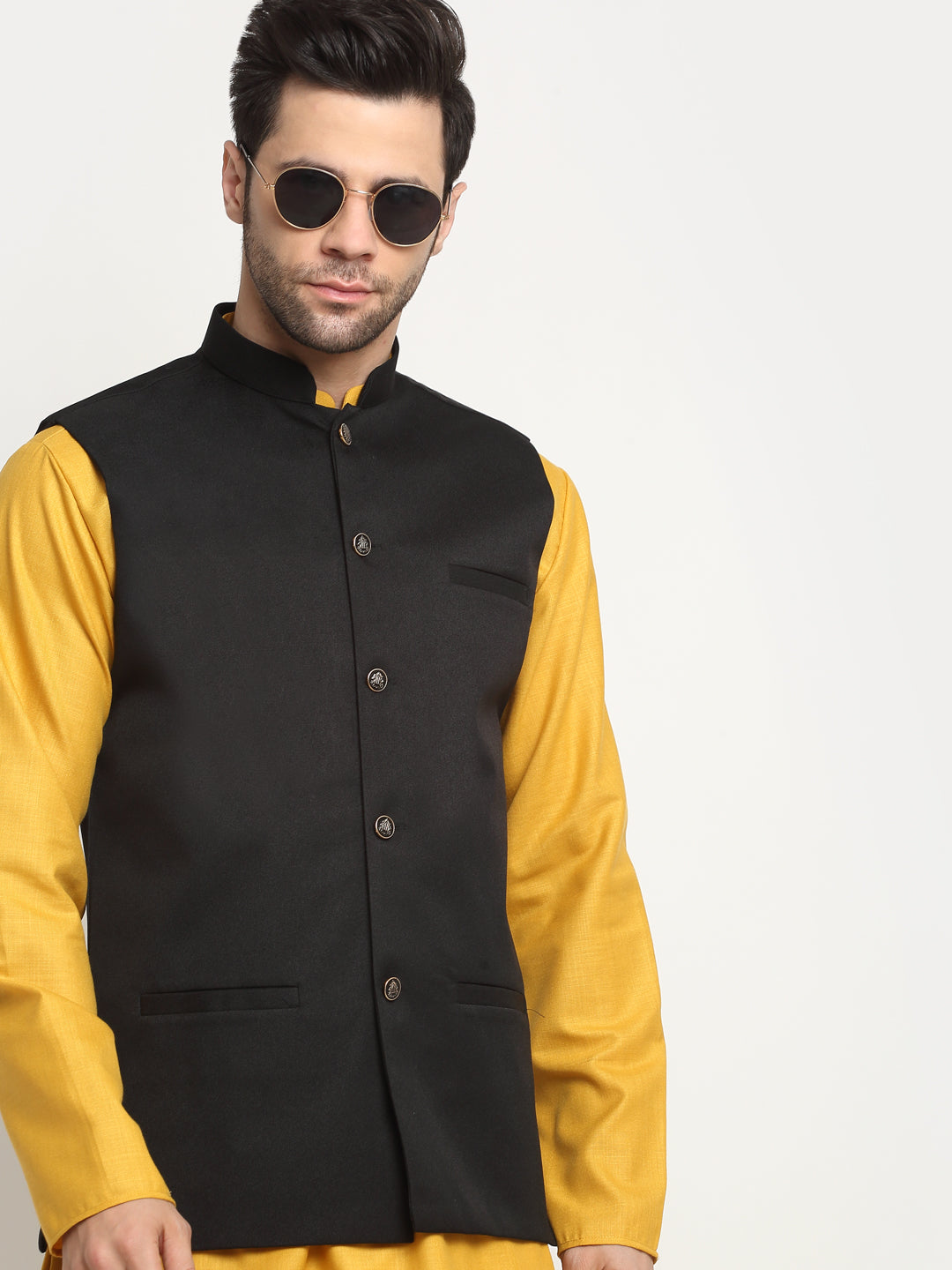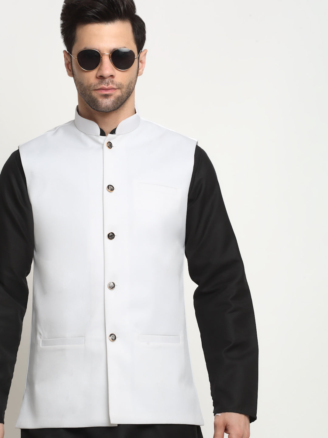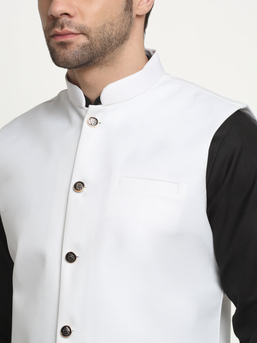 Cotton Twill Nehru jacket, has a mandarin collar, sleeveless, button closure, three pockets, and an attached lining.