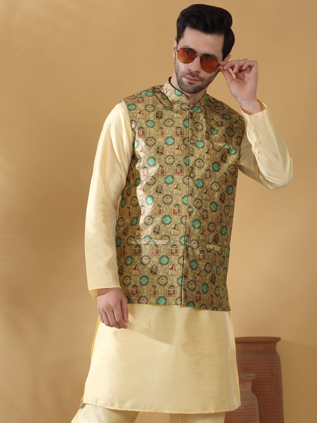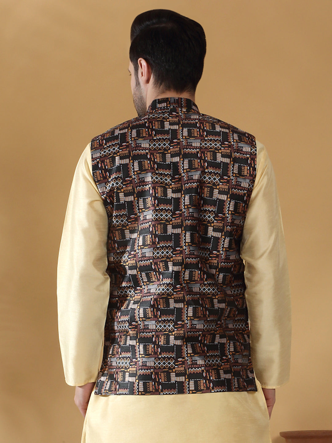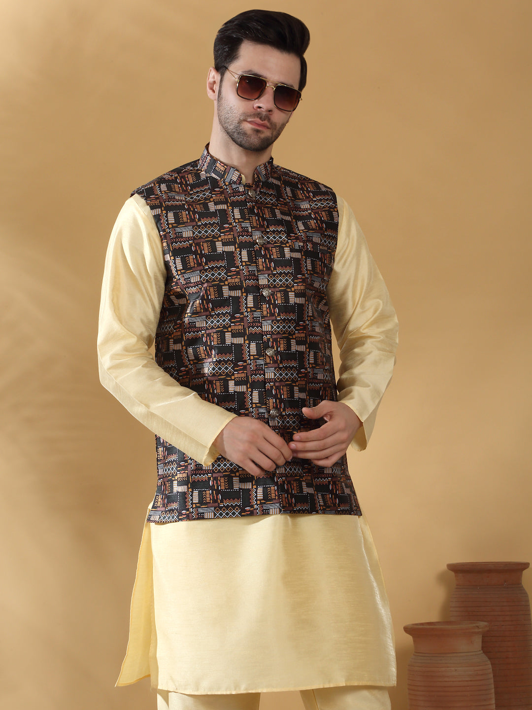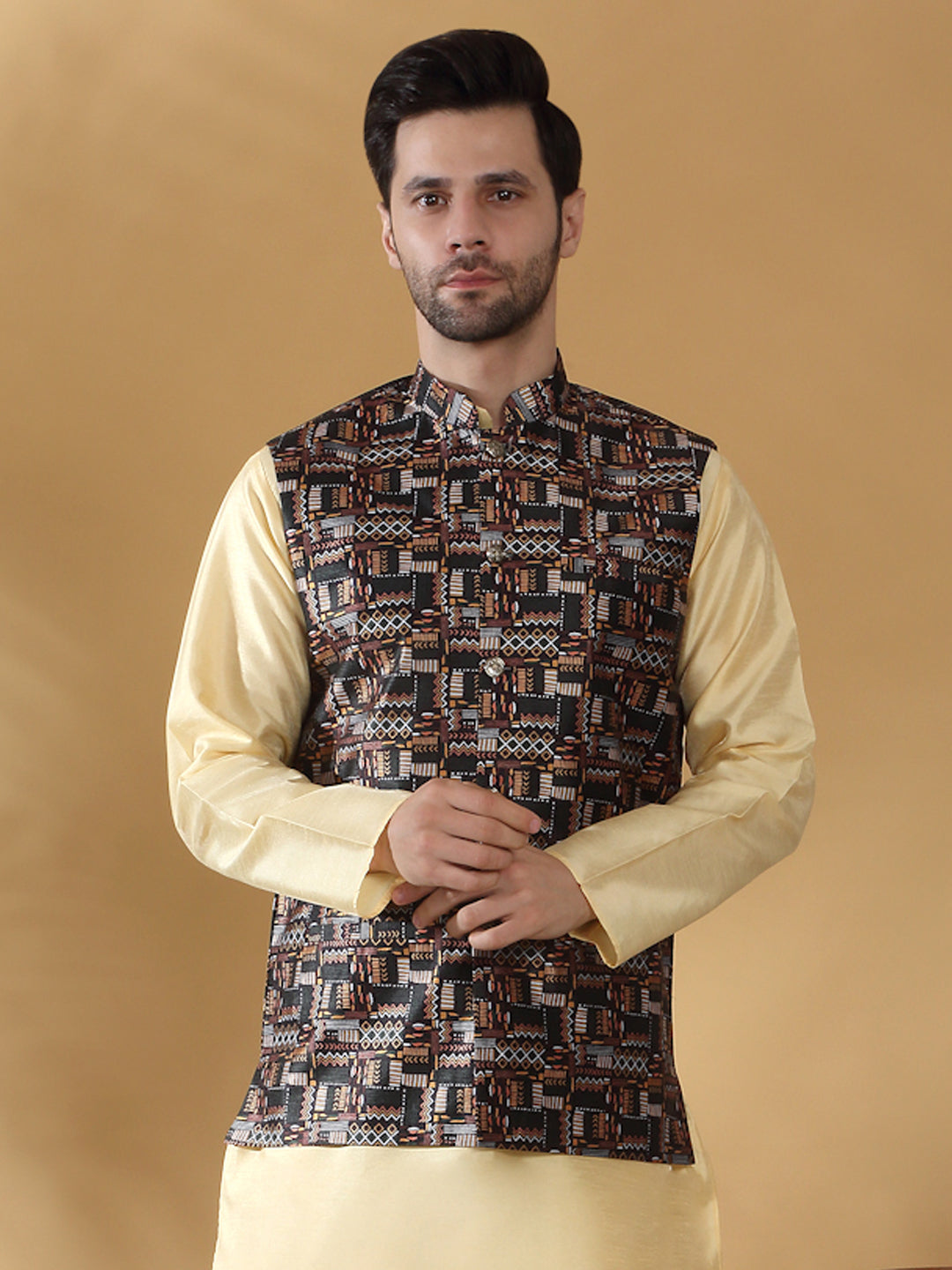 Elevate your ethnic style with this stunning Nehru jacket crafted from a luxurious silk blend fabric. Featuring an eye-catching abstract geometric print in earthy tones, this jacket perfectly balances traditional charm with modern aesthetics. The mandarin collar and sleek button placket add a refined touch, making it ideal for festive occasions, weddings, or cultural celebrations. Pair it with a solid kurta-pajama set to let the intricate design stand out. Comfortable yet classy, this Nehru jacket is a must-have for the contemporary gentleman.