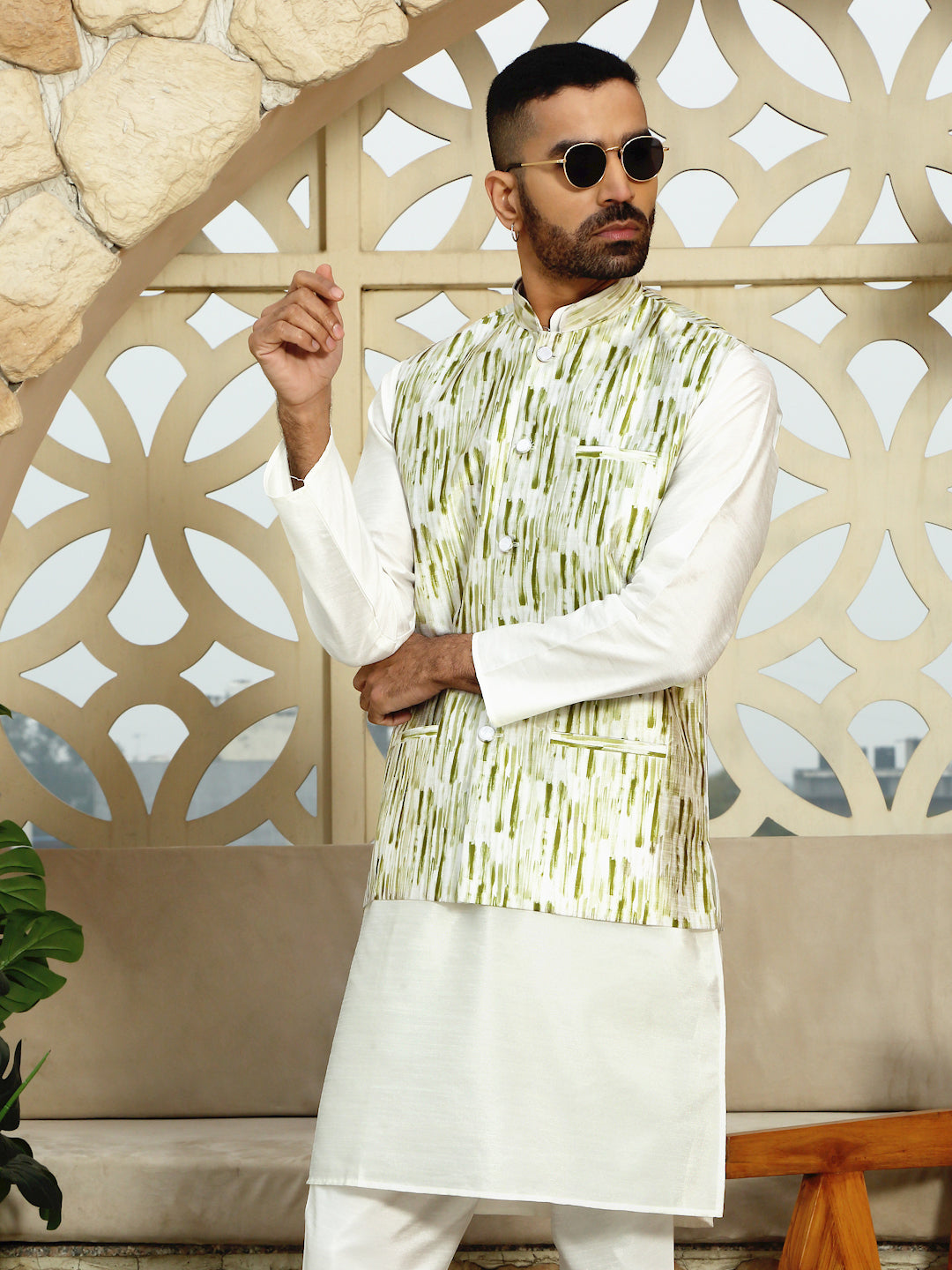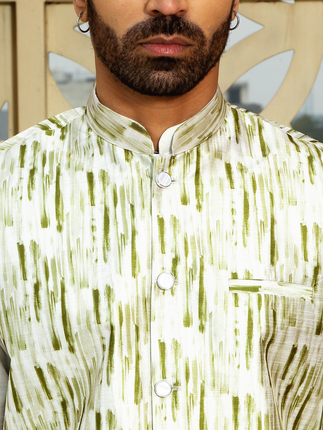 Introducing our Men's Silk Blend Printed Tie-Dye Sleeveless Nehru Jacket—a harmonious blend of traditional elegance and contemporary flair. Crafted from premium silk, this jacket offers a luxurious feel and a sophisticated sheen. The vibrant green hue, enhanced by a unique tie-dye print, adds a modern twist to the classic Nehru jacket design.