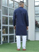 Navy Blue Embroidered straight knee length kurta, has a mandarin collar, long sleeves, side pockets, button closure, side slits, straight hem with drawstring closure White Churidar