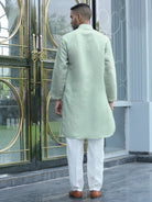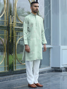 Royal elegance with this Men's Cotton Silk Kurta, featuring a majestic elephant motif embroidered yoke design that adds a touch of heritage to your ethnic wardrobe. Crafted from a luxurious cotton silk blend, the kurta offers a soft texture with a subtle sheen, perfect for festive and formal occasions.