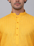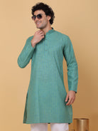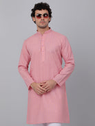 KRAFT INDIA Men Cotton Linen Striped Thread Work Knee Length Kurta With White Elastic Waistband Pyjama Set
