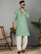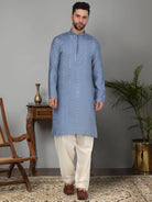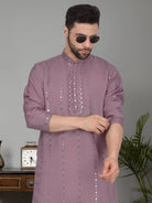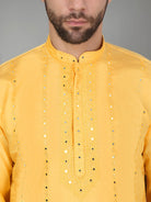 Introducing our Men's Cotton Silk Kurta, featuring a unique Mirror Work Yoke design and Mandarin Collar. Crafted from a luxurious blend of cotton and silk, this kurta offers comfort and style. Its knee length design and side pocket provides convenience, making it the perfect addition to any gentleman's wardrobe.