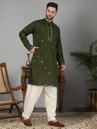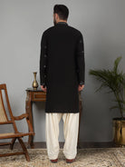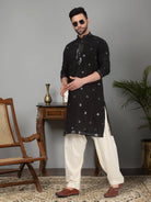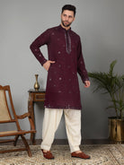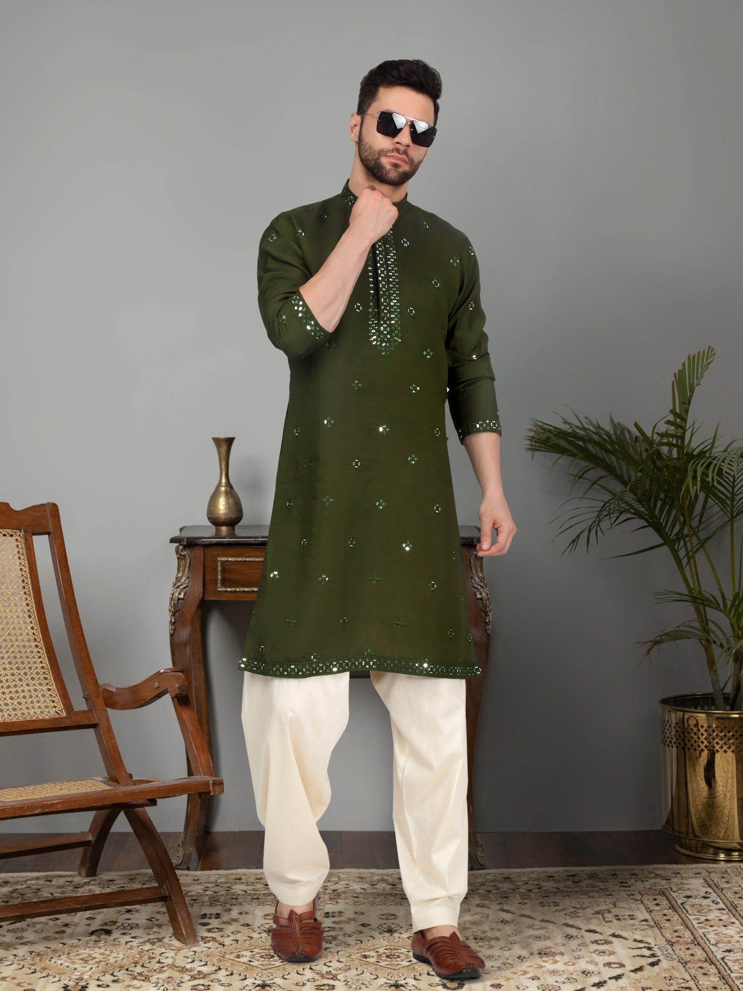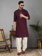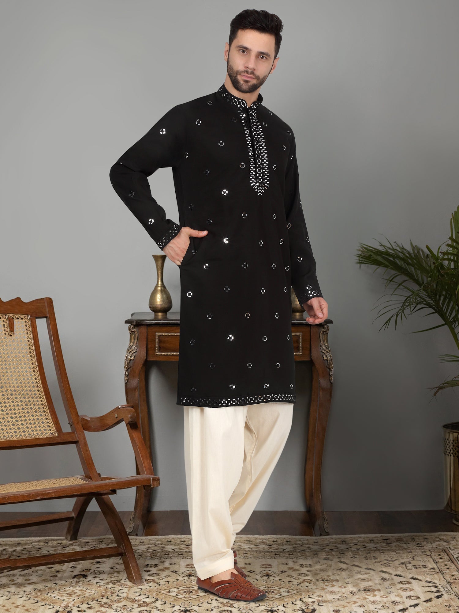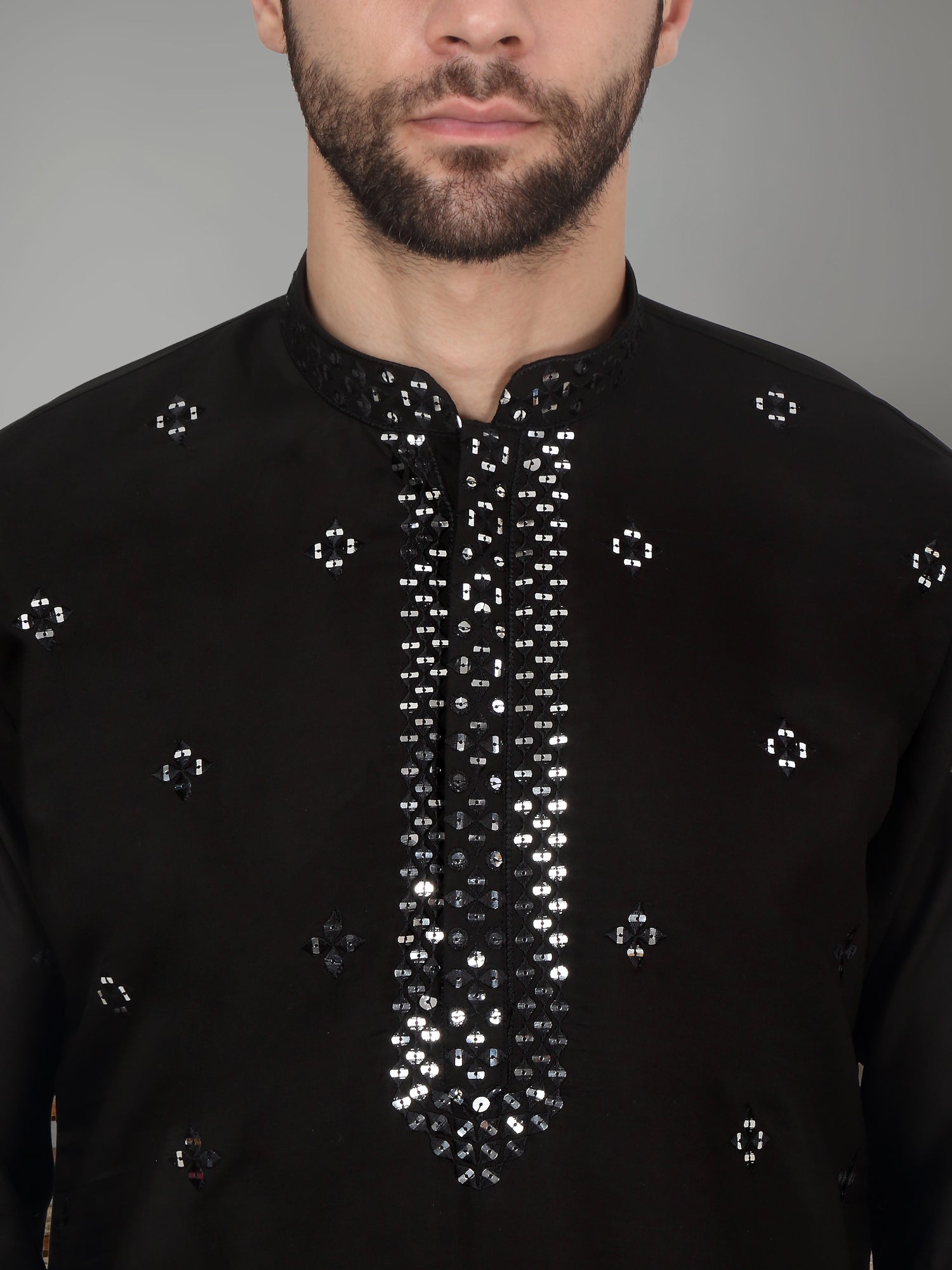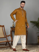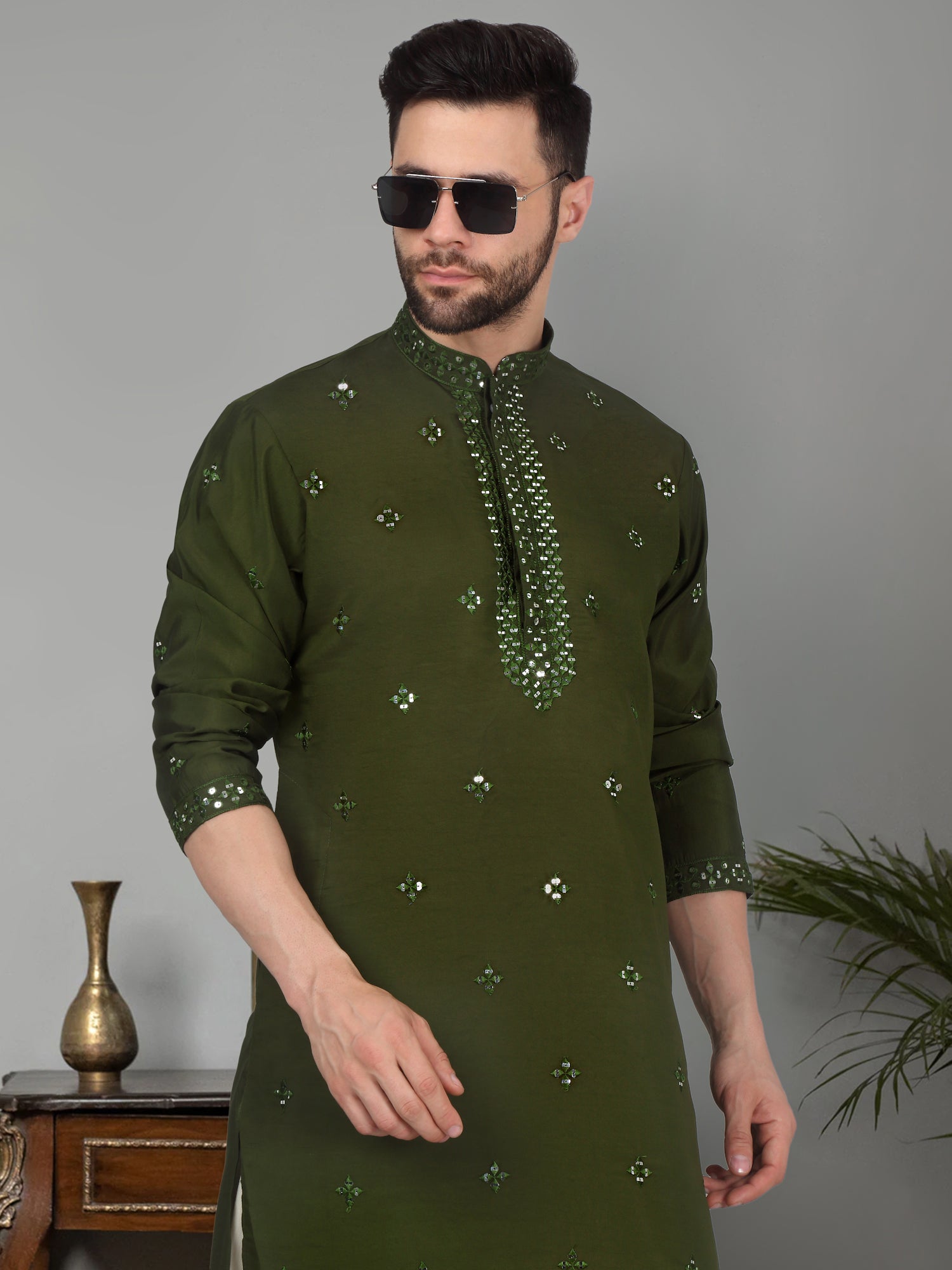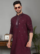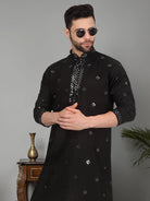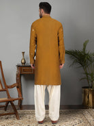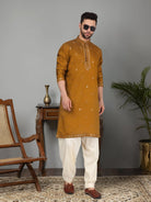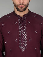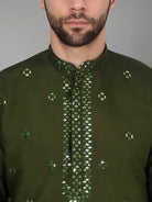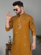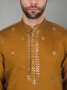 Introducing our Men's Cotton Silk Kurta, featuring a unique Mirror Work Yoke design and a Mandarin Collar. Crafted from a luxurious blend of cotton and silk, this kurta offers both comfort and style. Its knee length design and side pocket provides convenience, making it the perfect addition to any gentleman's wardrobe.