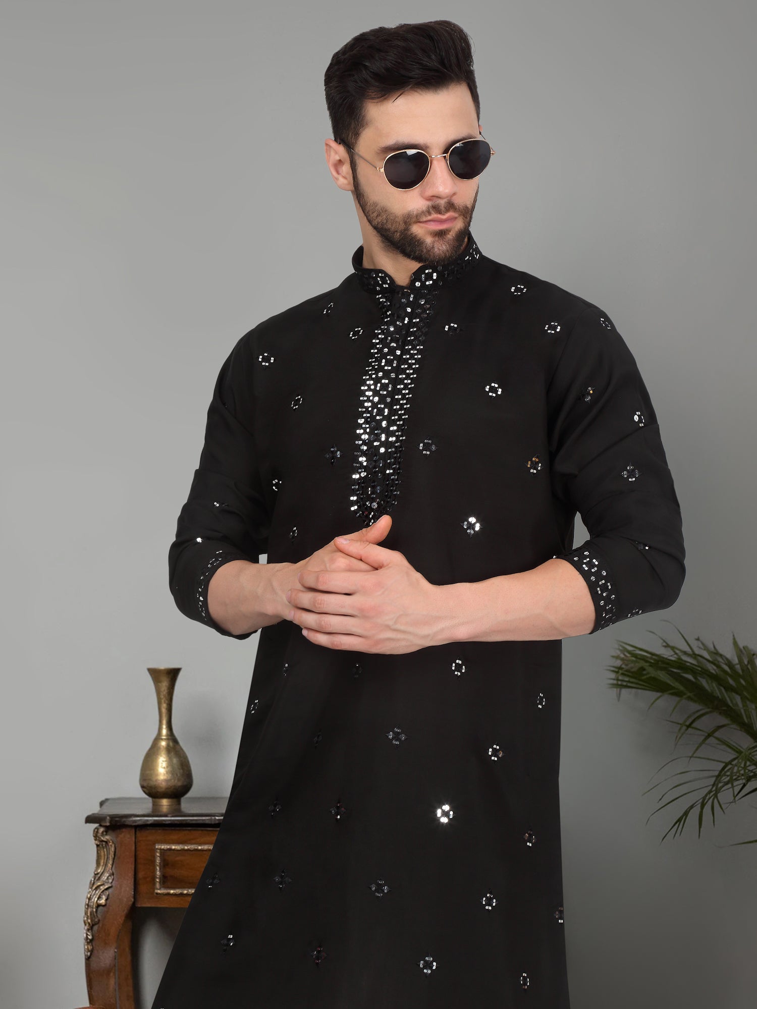 LUXE- Cotton Silk Mirror Work Yoke design Mandarin Collar Long Sleeve Kurta