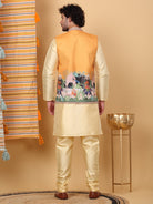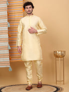 LUXE- Silk Blend Solid Knee Length Beige Kurta Churidar With Printed Silk Blend Nehru Jacket Set