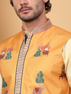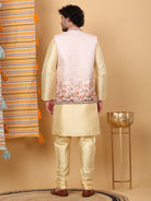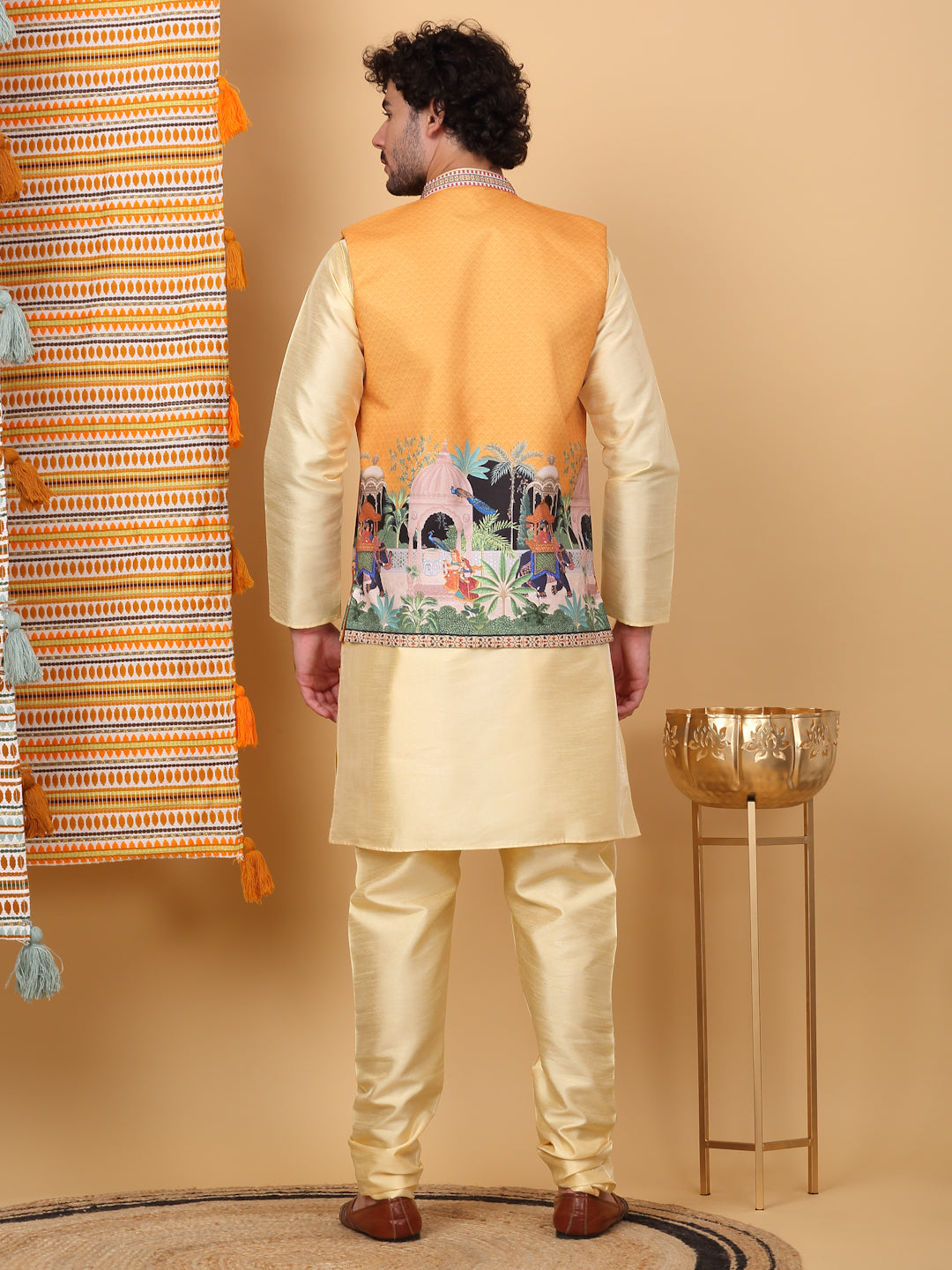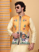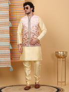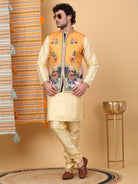 This premium men's Beige kurta churidar set is crafted with a luxurious silk blend, featuring a straight knee length design with a mandarin collar, side slits, and pockets for functional elegance. The long sleeves are adorned with a floral print and a loop button closure adds a touch of sophistication. Complete the look with the included Nehru jacket, featuring a sleeveless design, front pocket, and satin lining for added comfort.