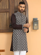 The kurta is crafted from a high-quality cotton silk blend, offering a soft, smooth feel and breathable comfort. The trousers are made of a durable cotton blend, ensuring a relaxed yet sharp fit. The white kurta features striking geometric embroidery, adding a modern and sophisticated touch to this traditional attire. With long sleeves, a button closure front, and a knee-length cut, this kurta offers a refined and timeless appeal. Practical side pockets add functionality to the elegant design. Paired with cotton white trousers, tailored to perfection, ensuring a clean and polished look for any occasion.