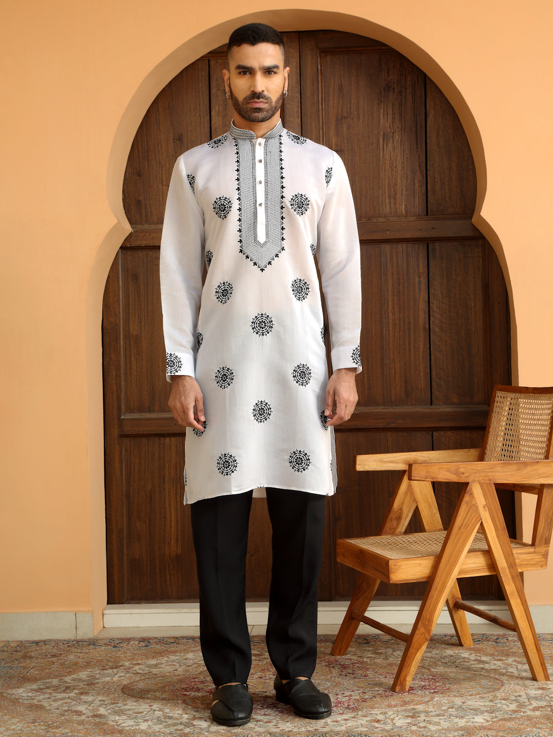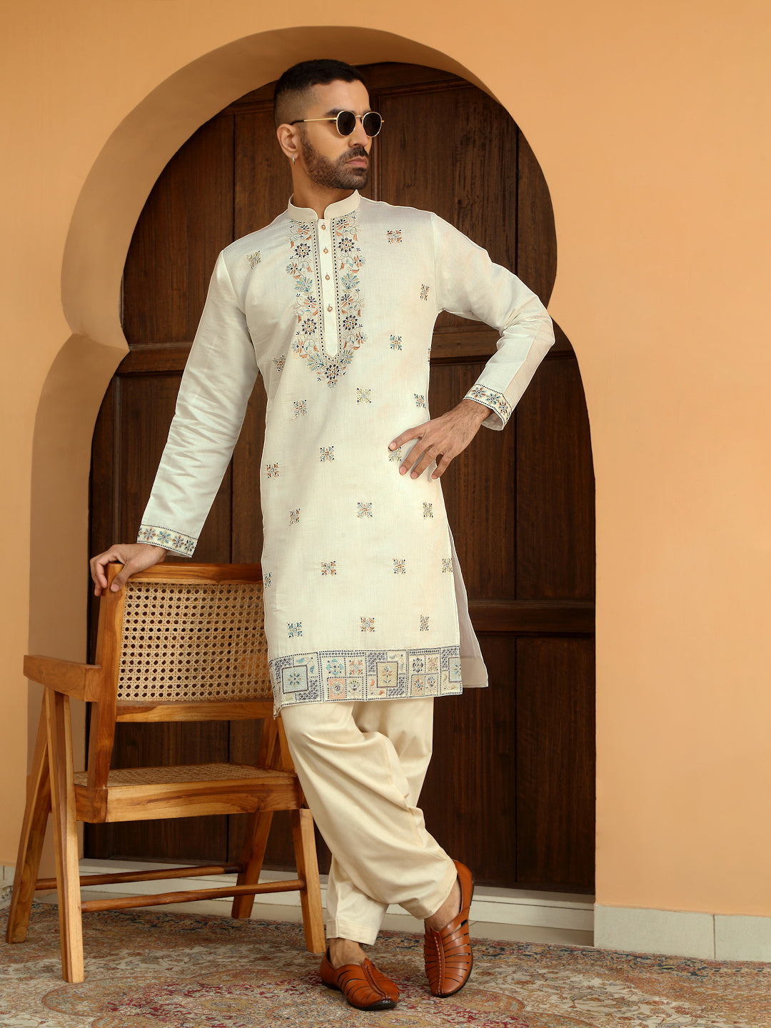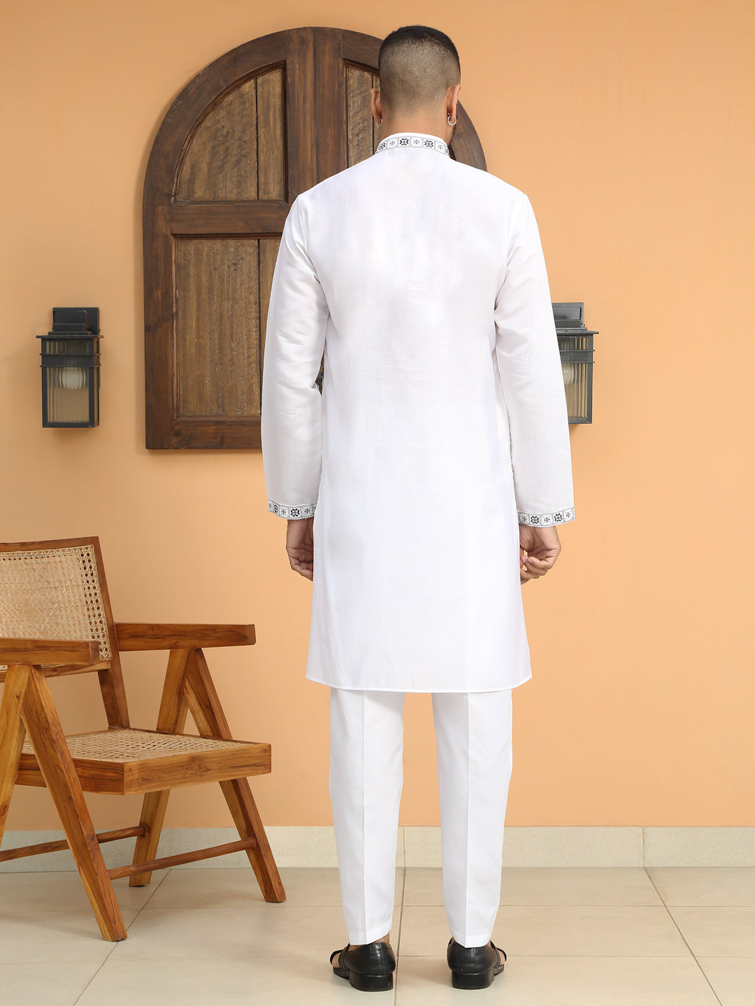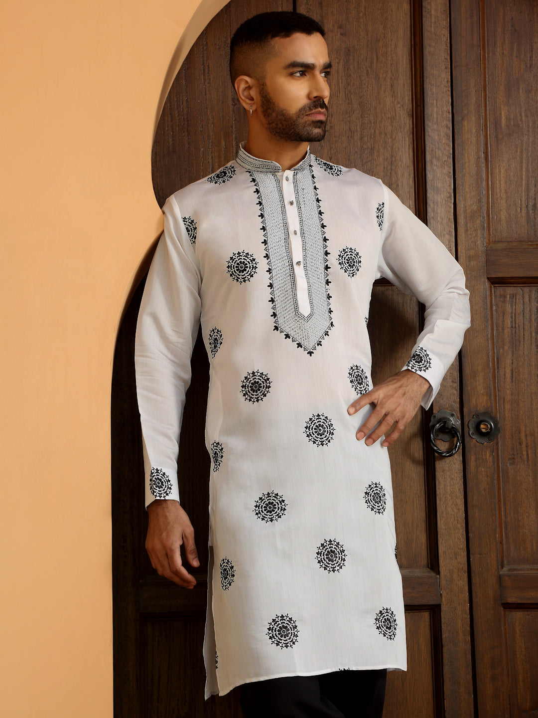 LUXE- Cotton Silk Ethnic Motifs, White Embroidered Mandarin Collar, Long Sleeve Kurta