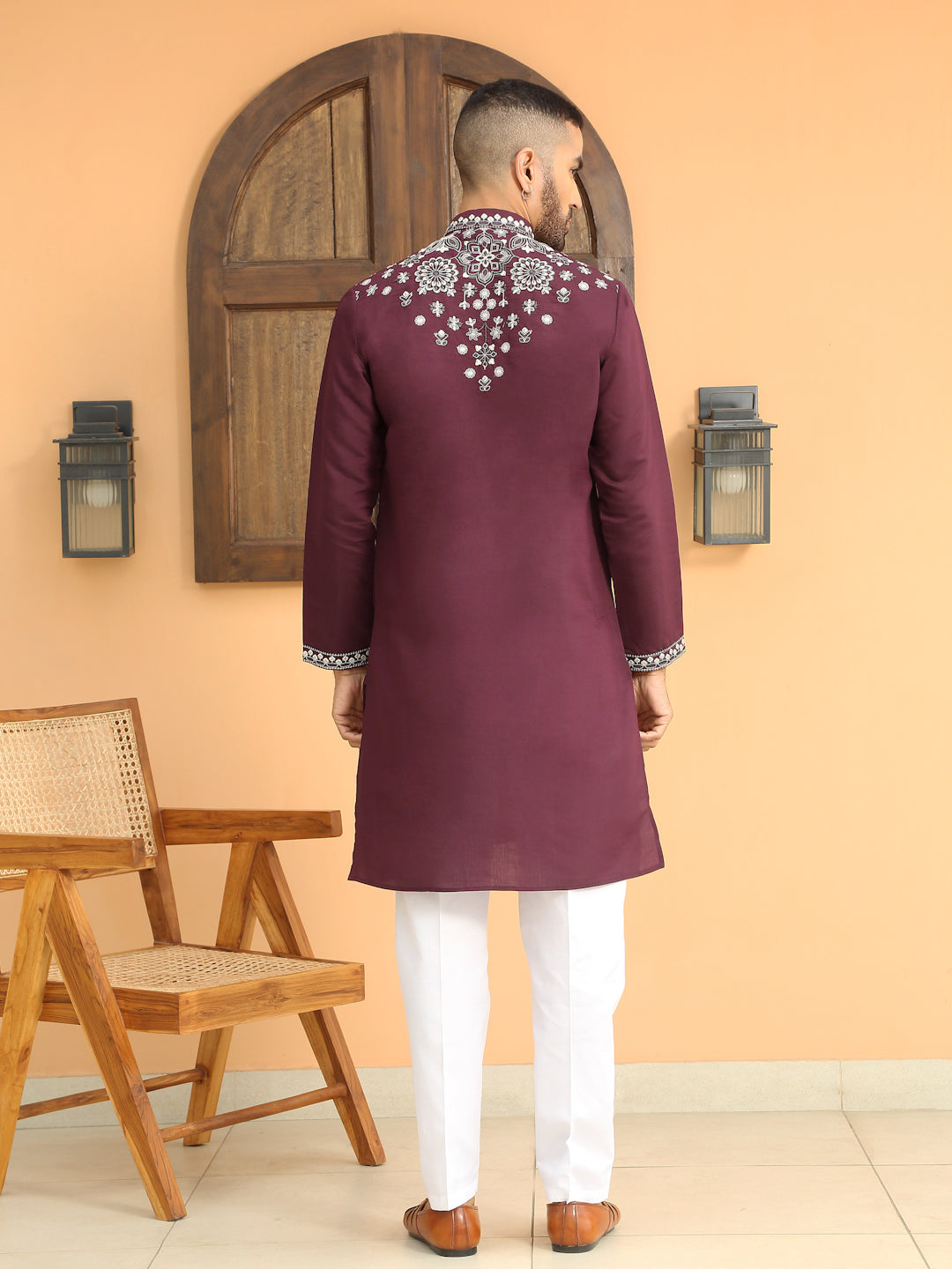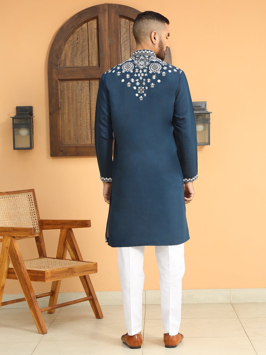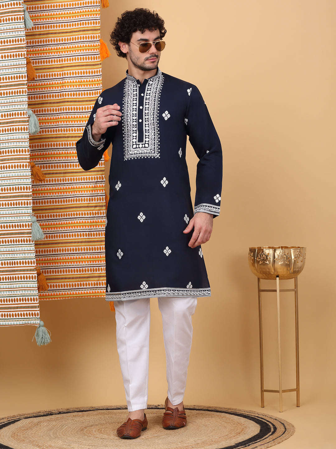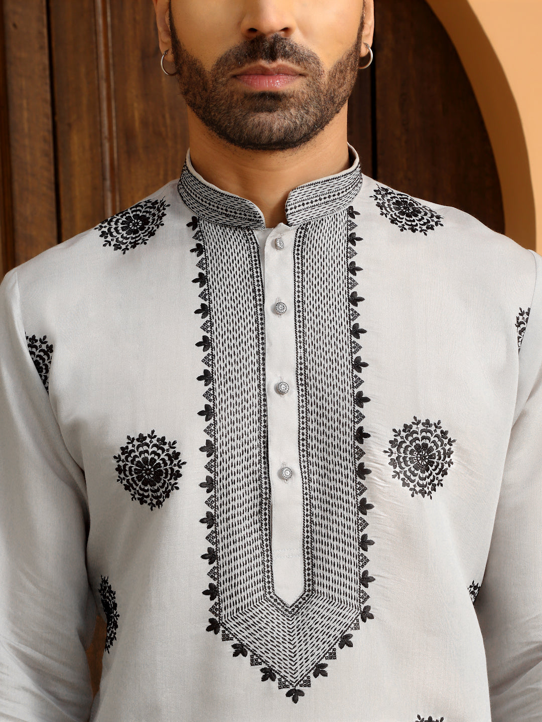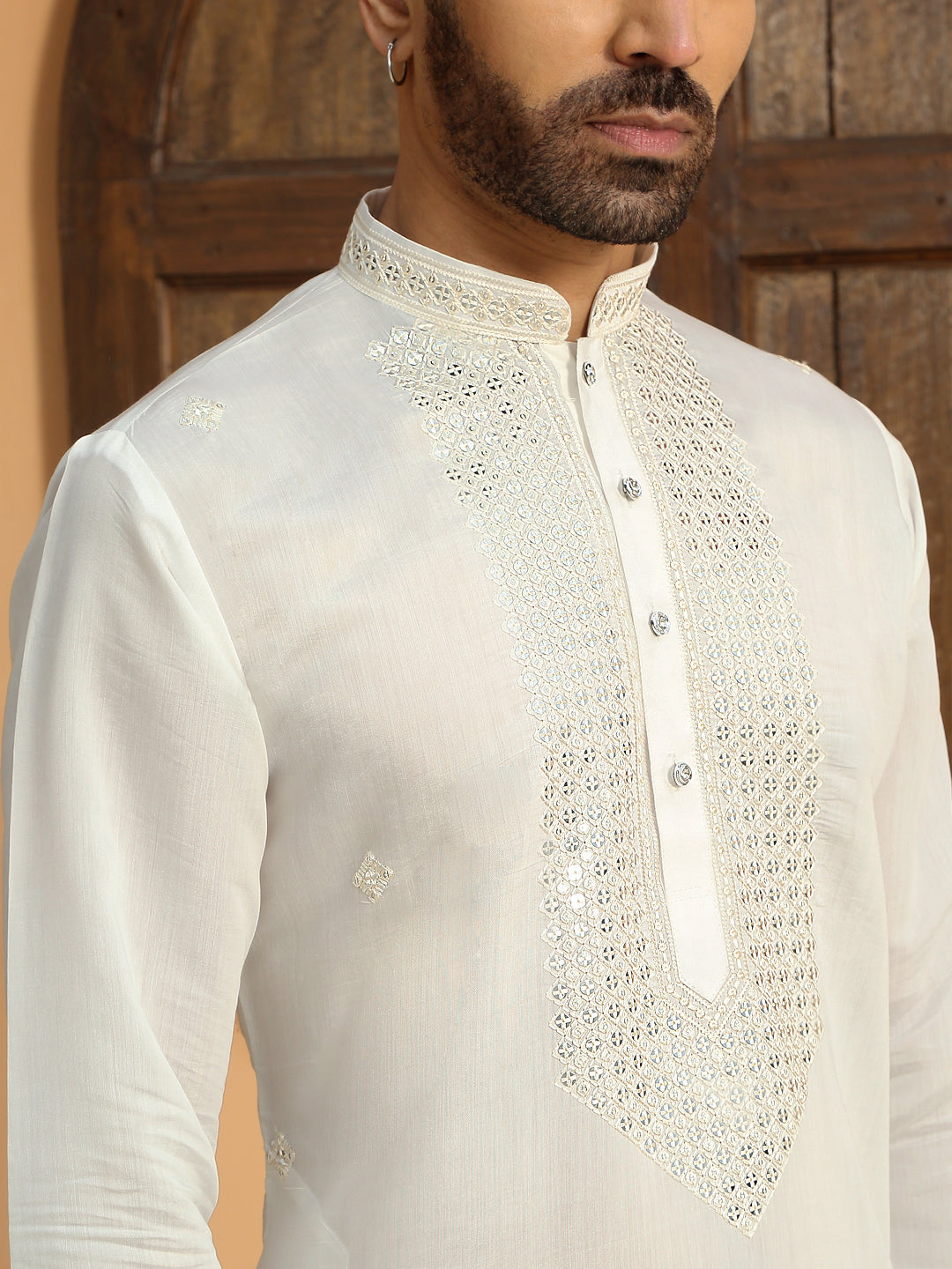LUXE- Cotton Silk Ethnic Motifs, White Embroidered Mandarin Collar, Long Sleeve Kurta