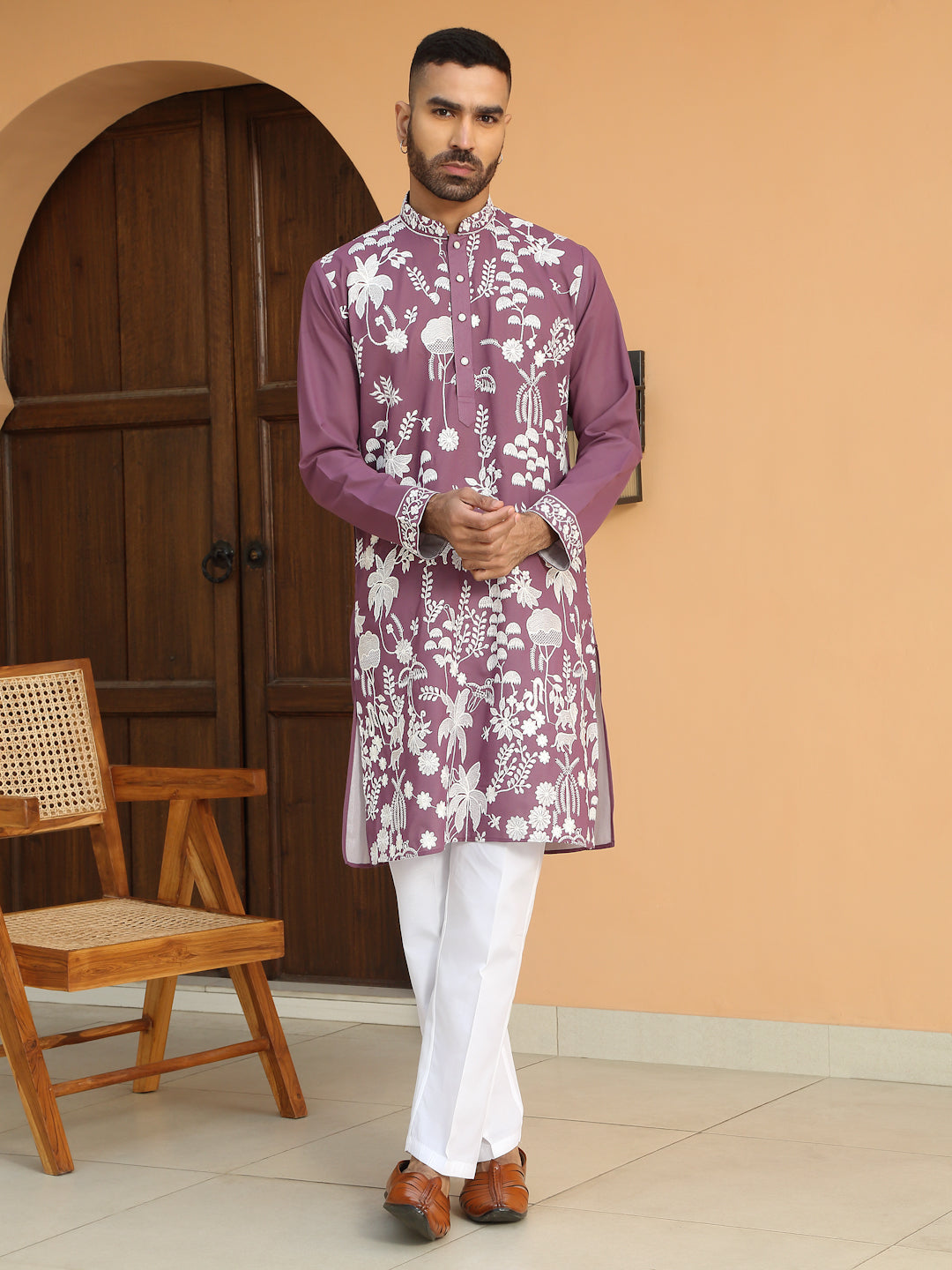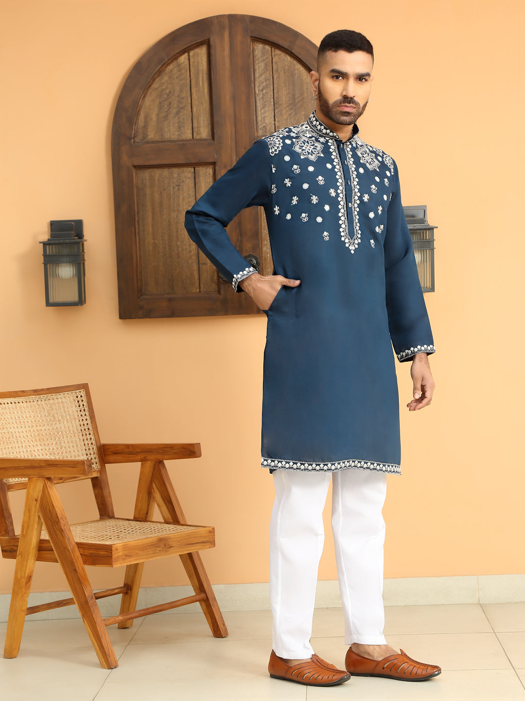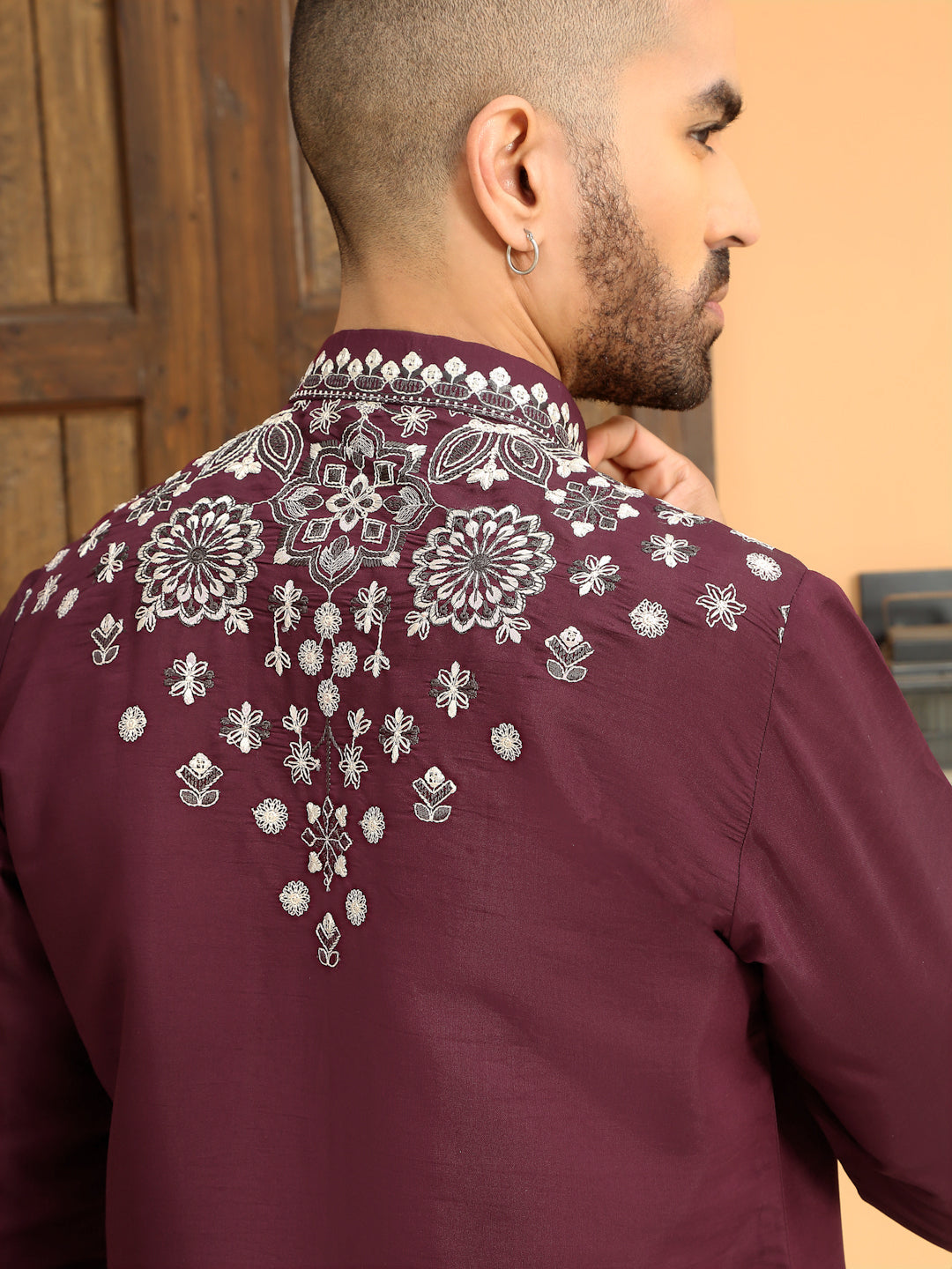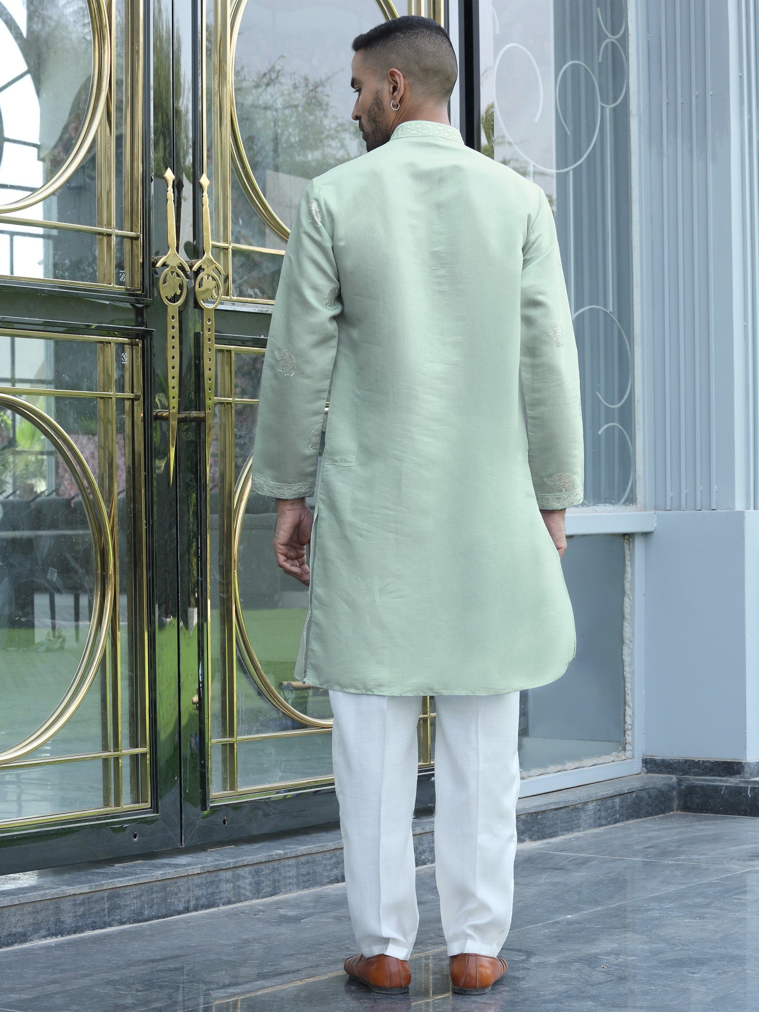 LUXE- Cotton Silk Ethnic Motifs, White Embroidered Mandarin Collar, Long Sleeve Kurta