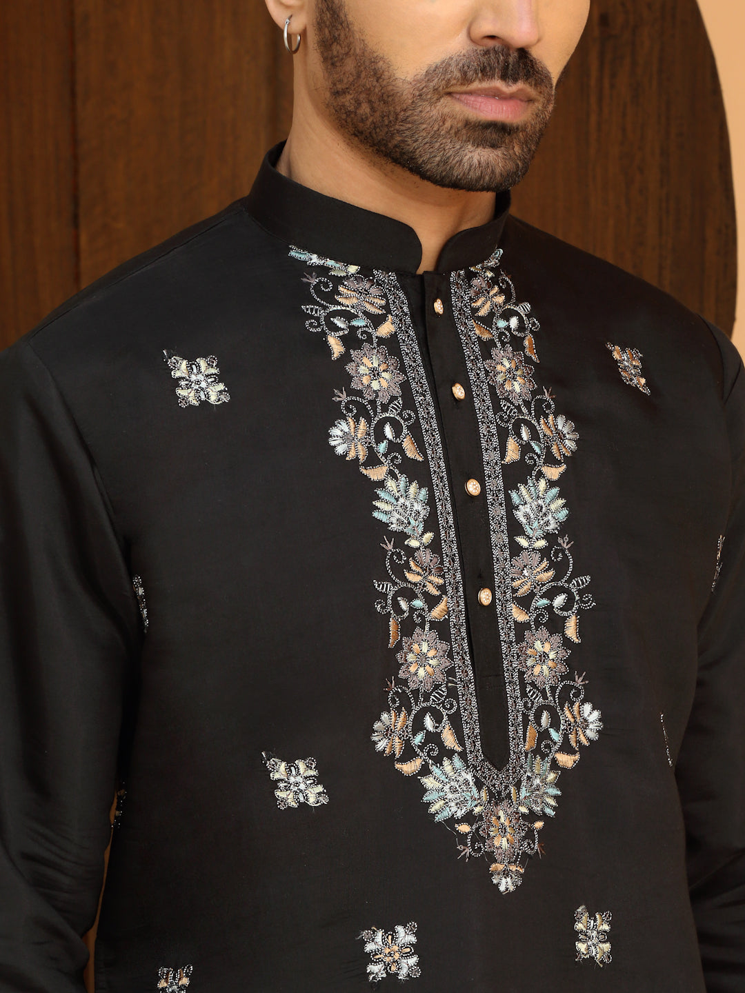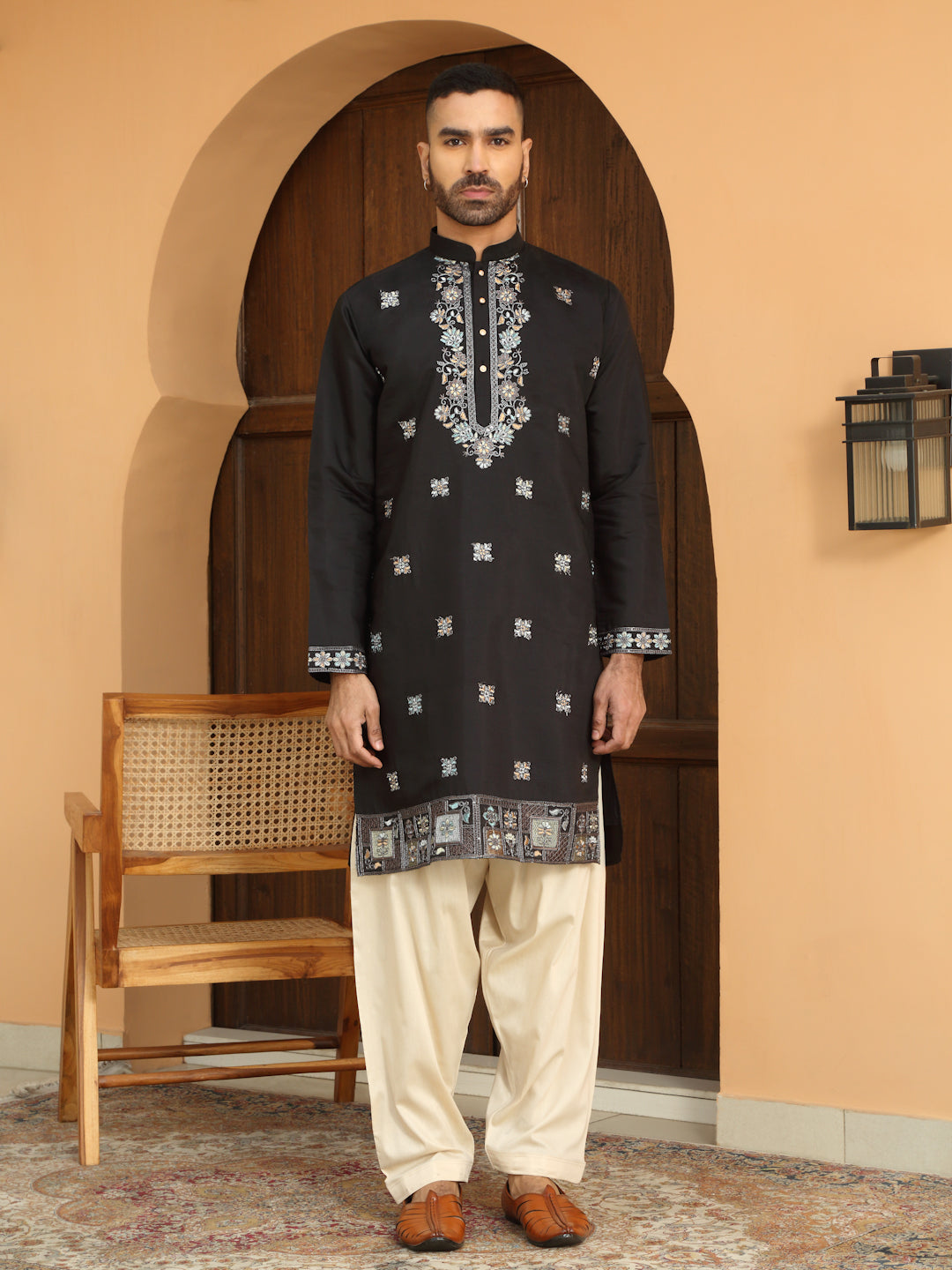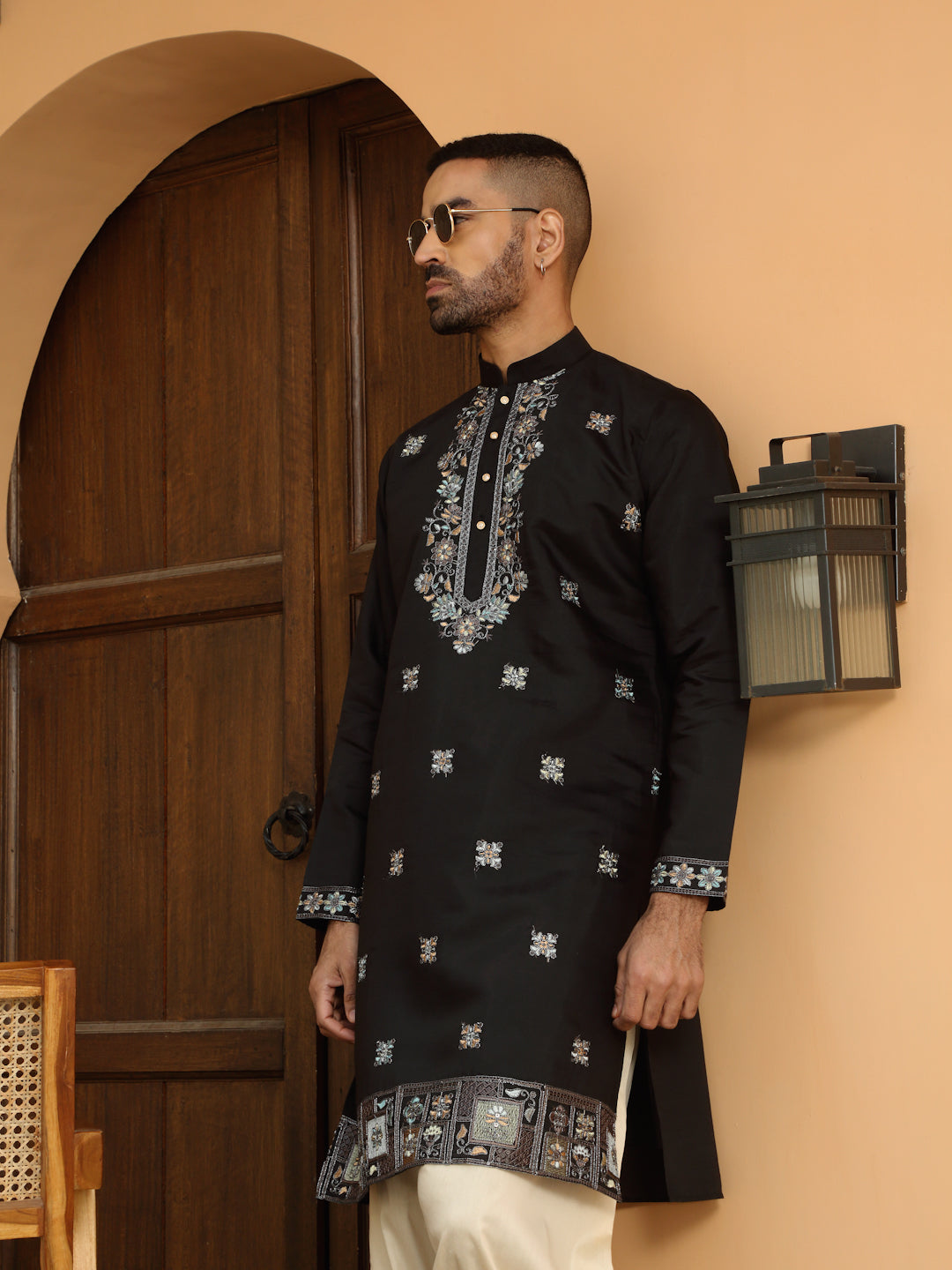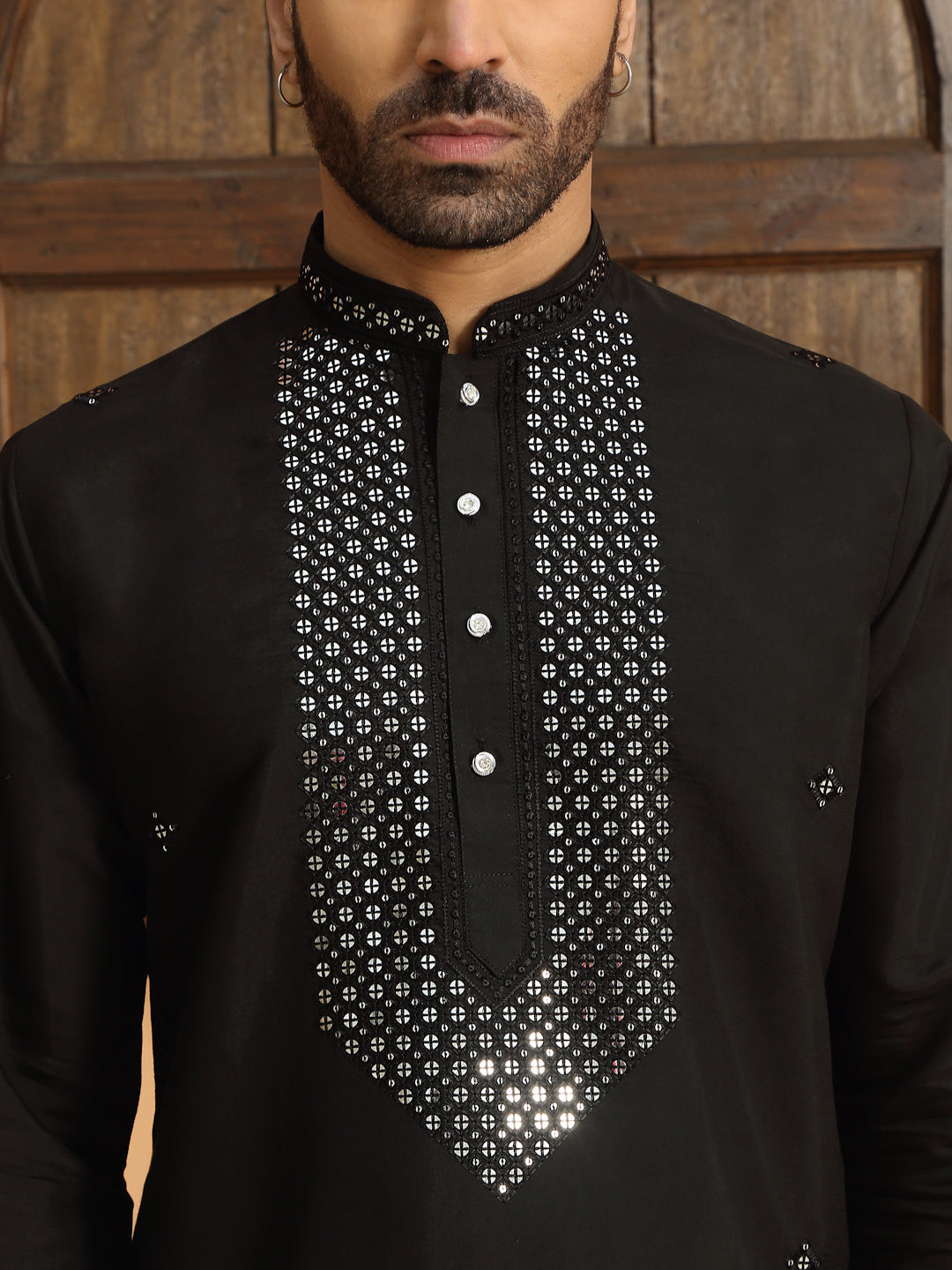 LUXE- Ethnic Motifs Black Sequins Embroidered Cotton Silk Kurta