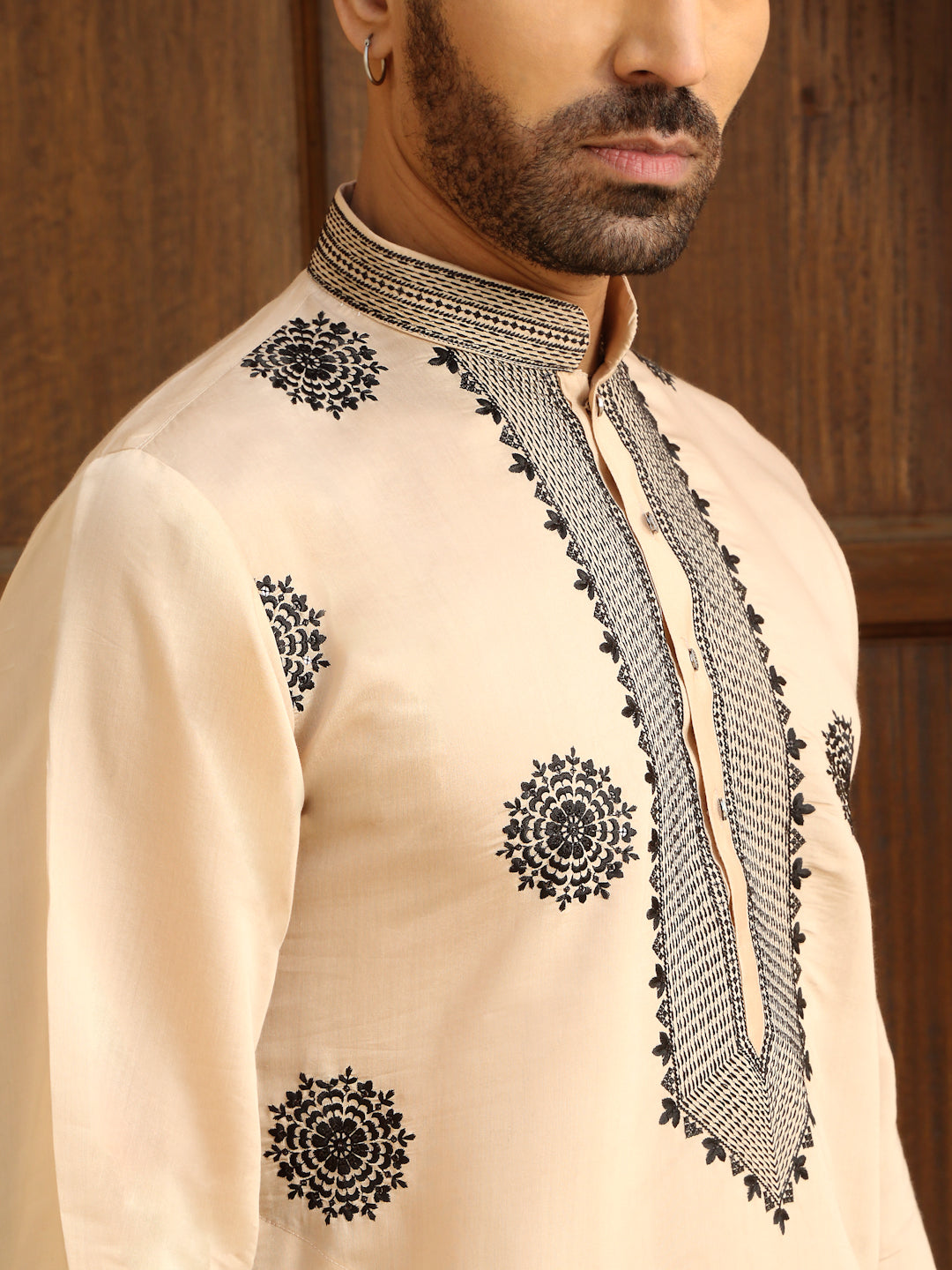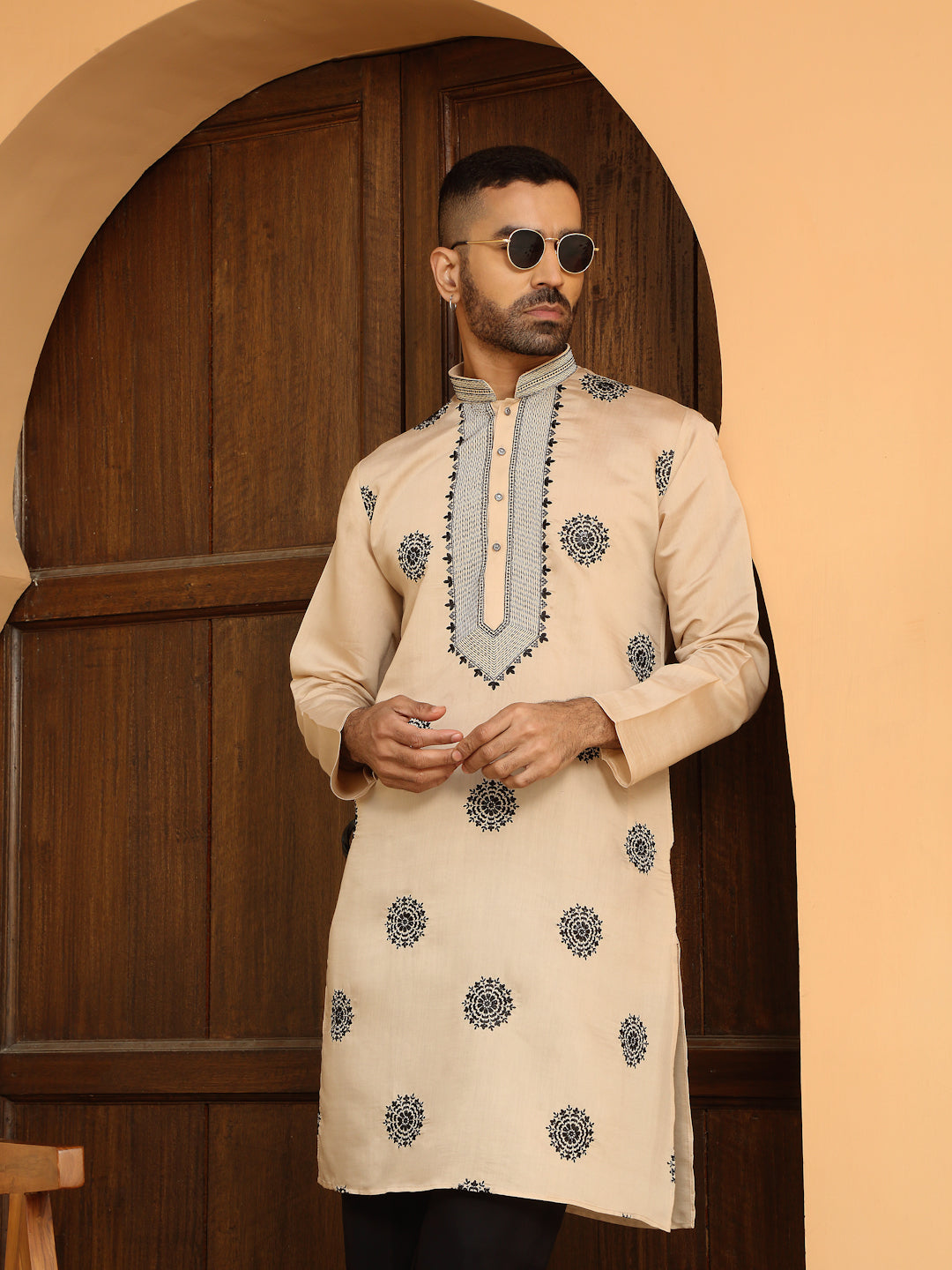 LUXE- Cotton Silk Mirror Work Yoke design Mandarin Collar Long Sleeve Kurta with Elastic Waistband Beige Salwar