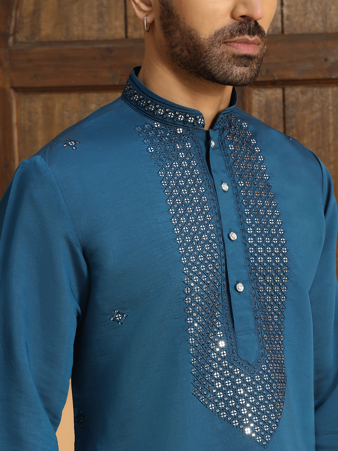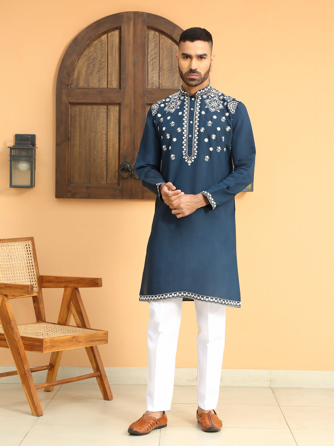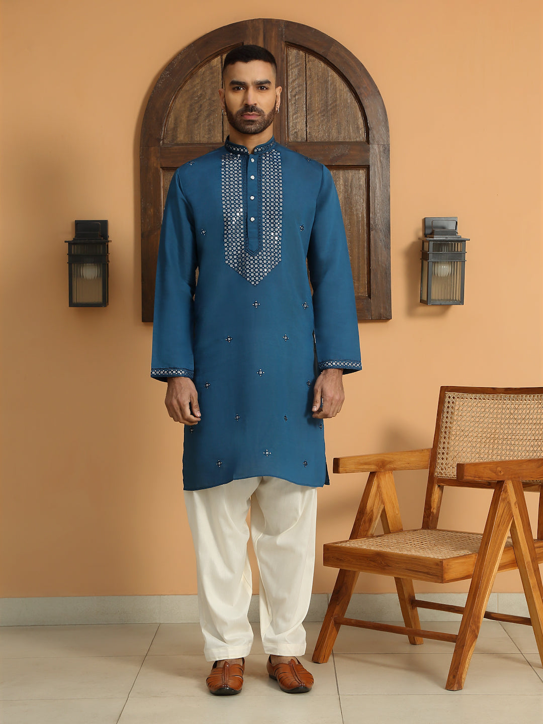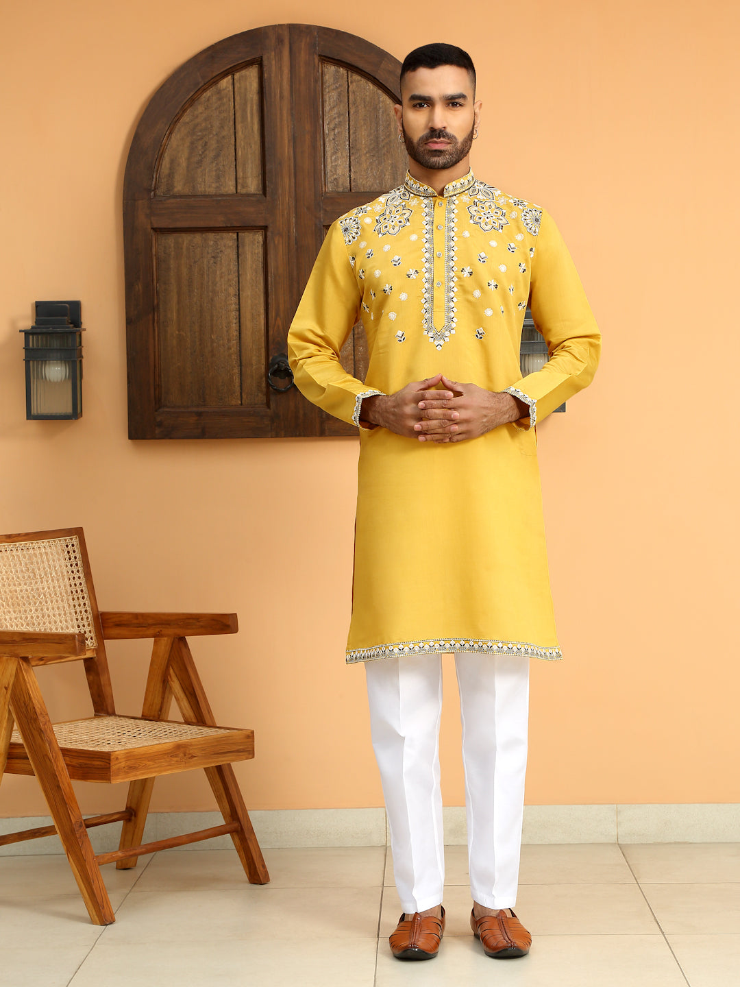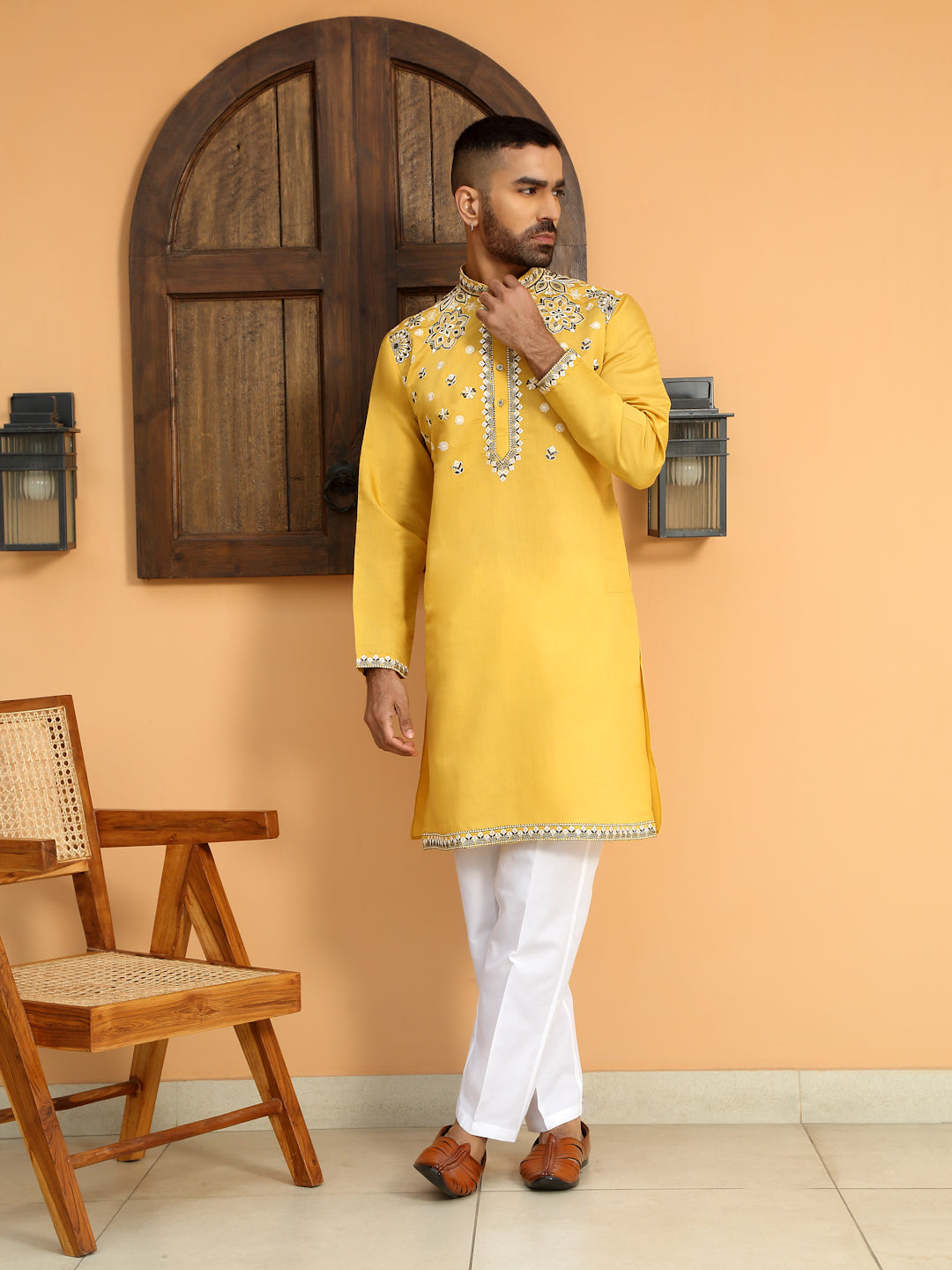 LUXE- Cotton Silk Mirror Work Yoke design Mandarin Collar Long Sleeve Kurta