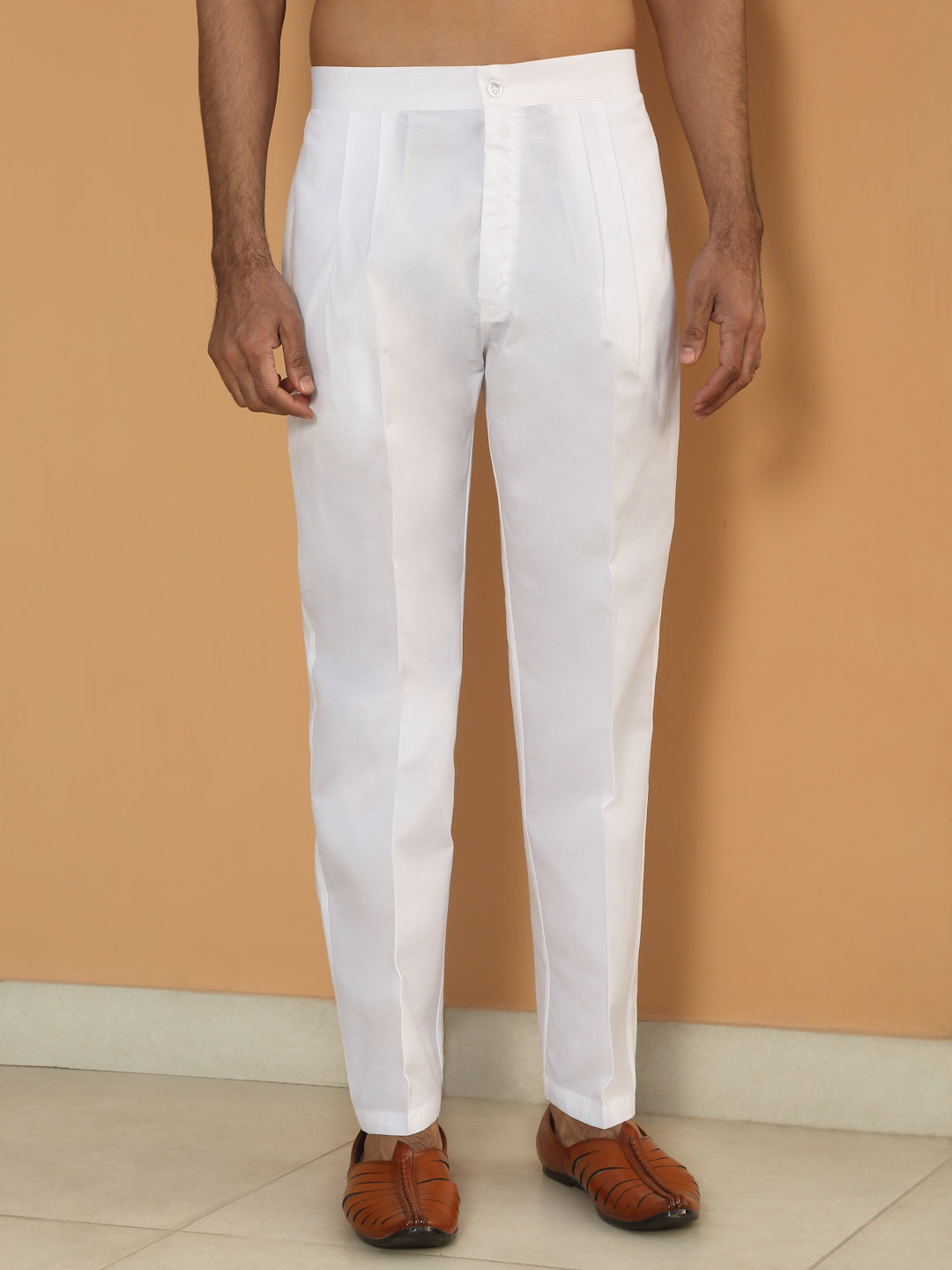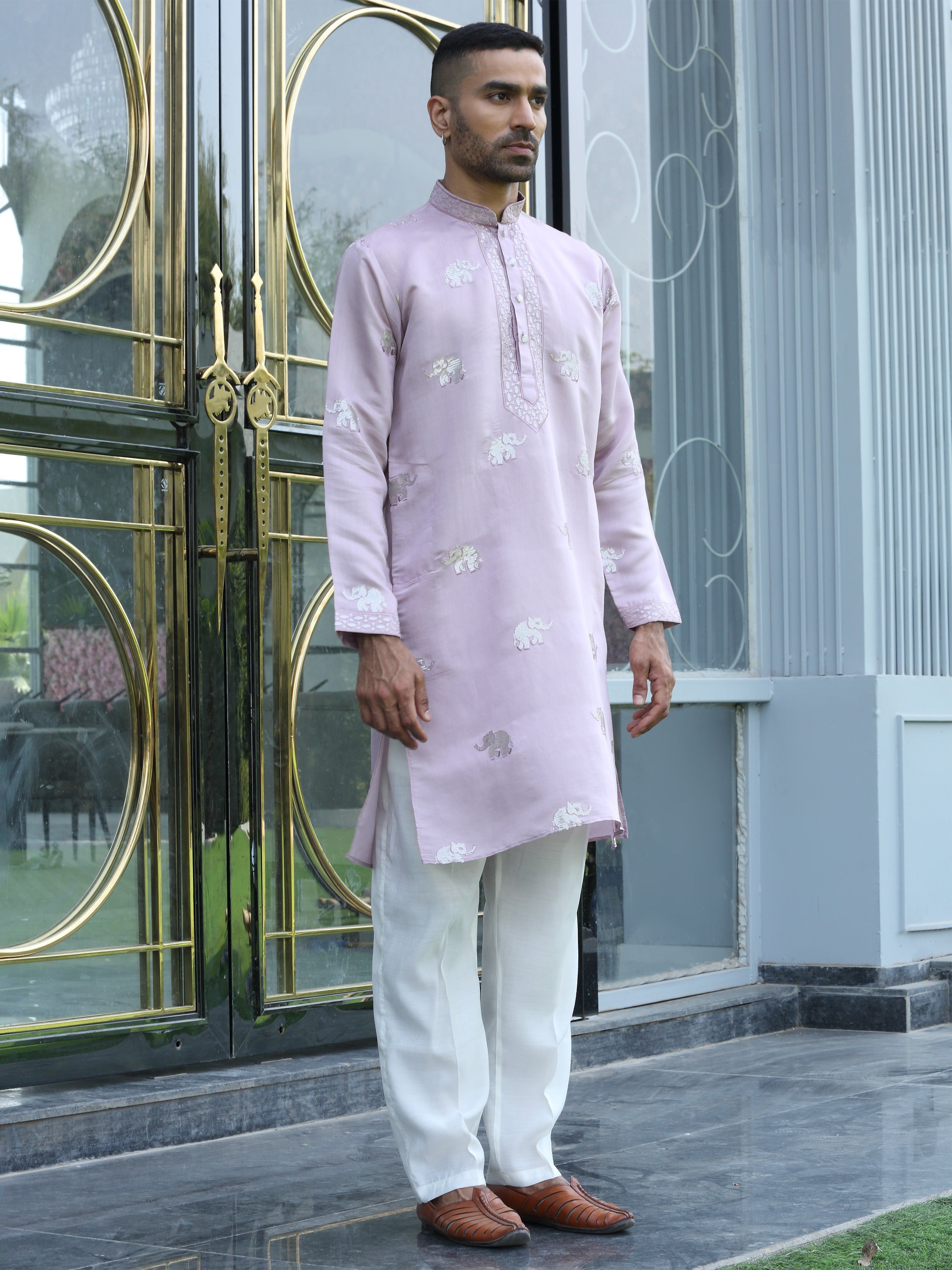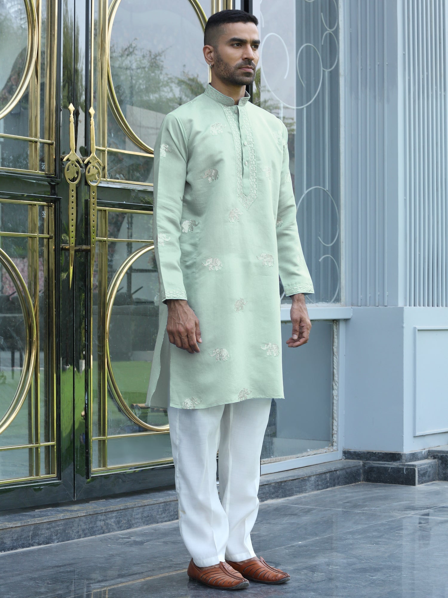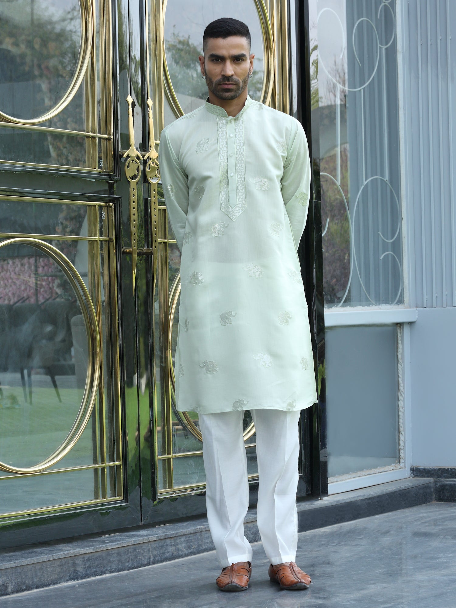 LUXE- Cotton Silk Yoke Design Elephant Embroidered Kurta and Matching Duppta with Cotton silk Cream Trouser pant