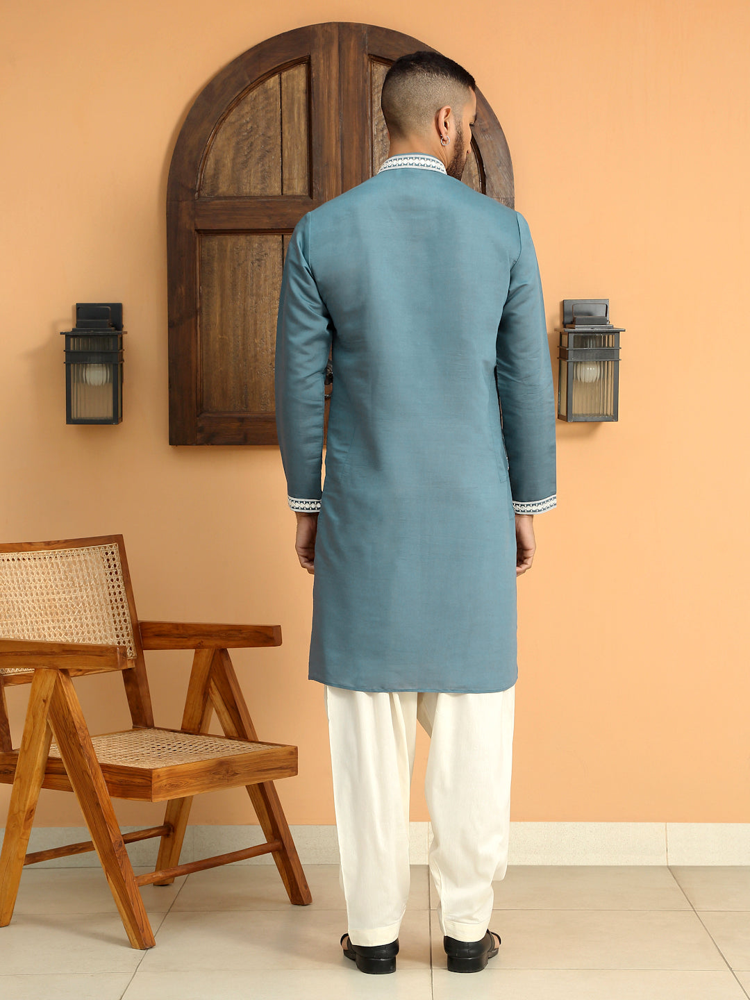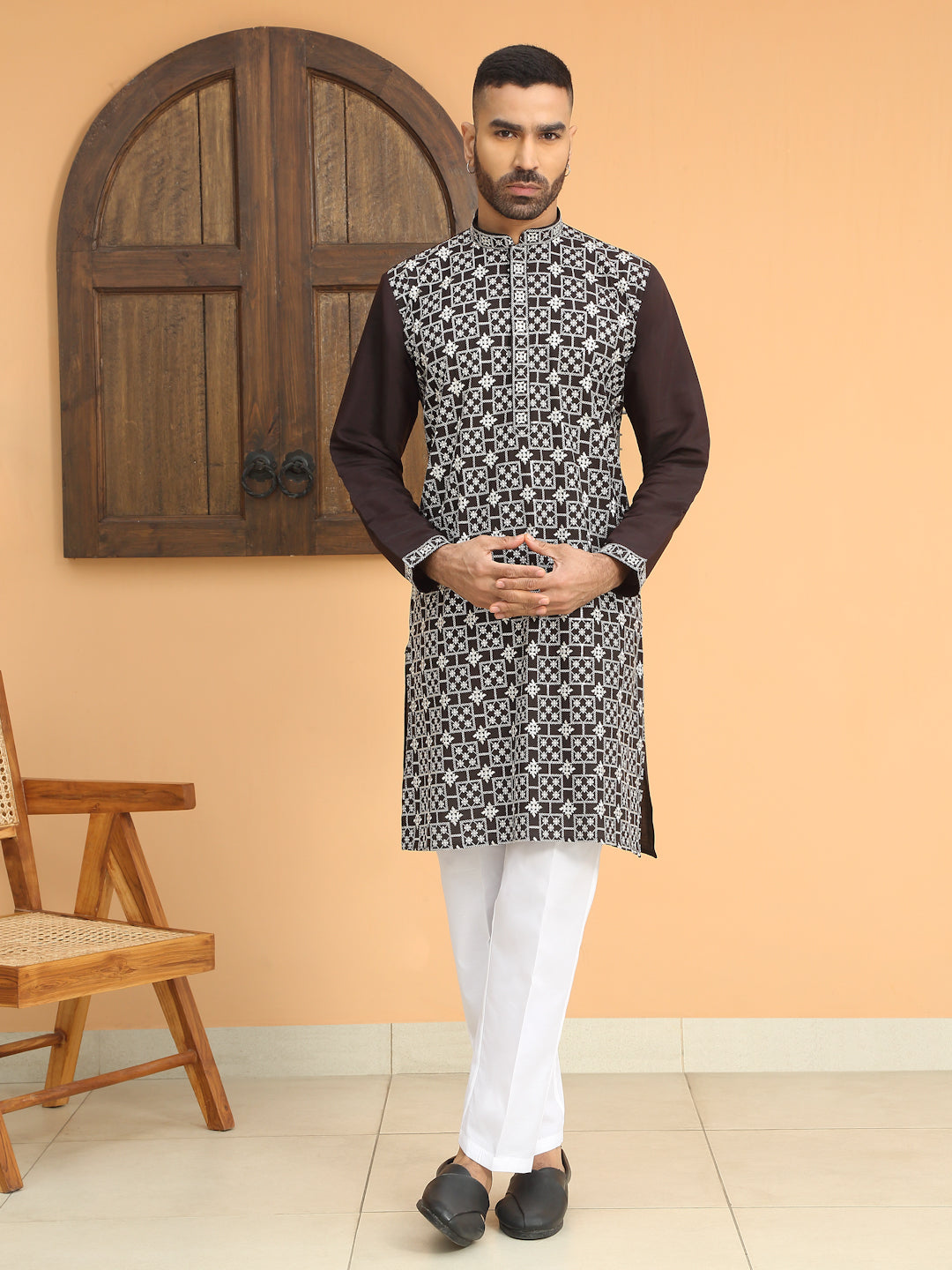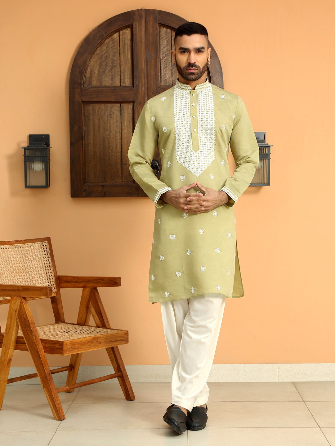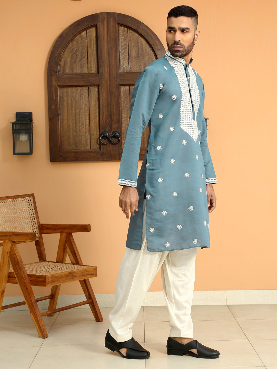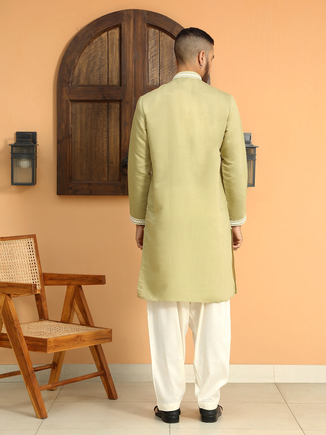 LUXE- Men Cotton Embroidered Sequenced Pathani Kurta with White Salwar set