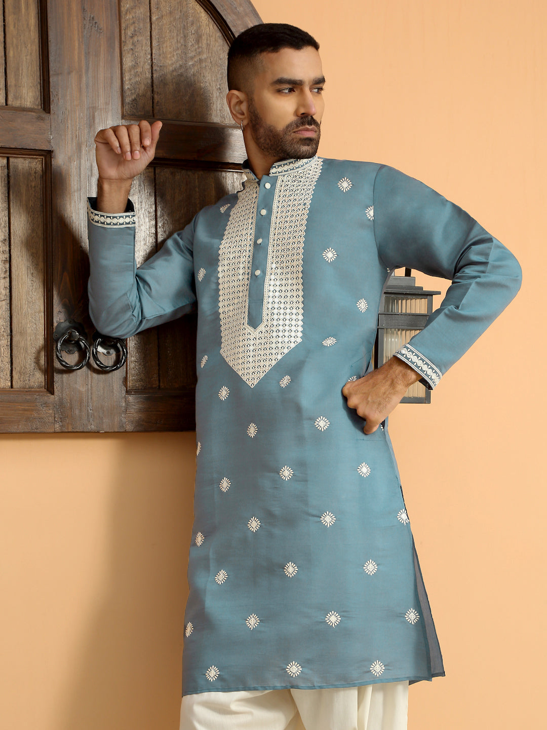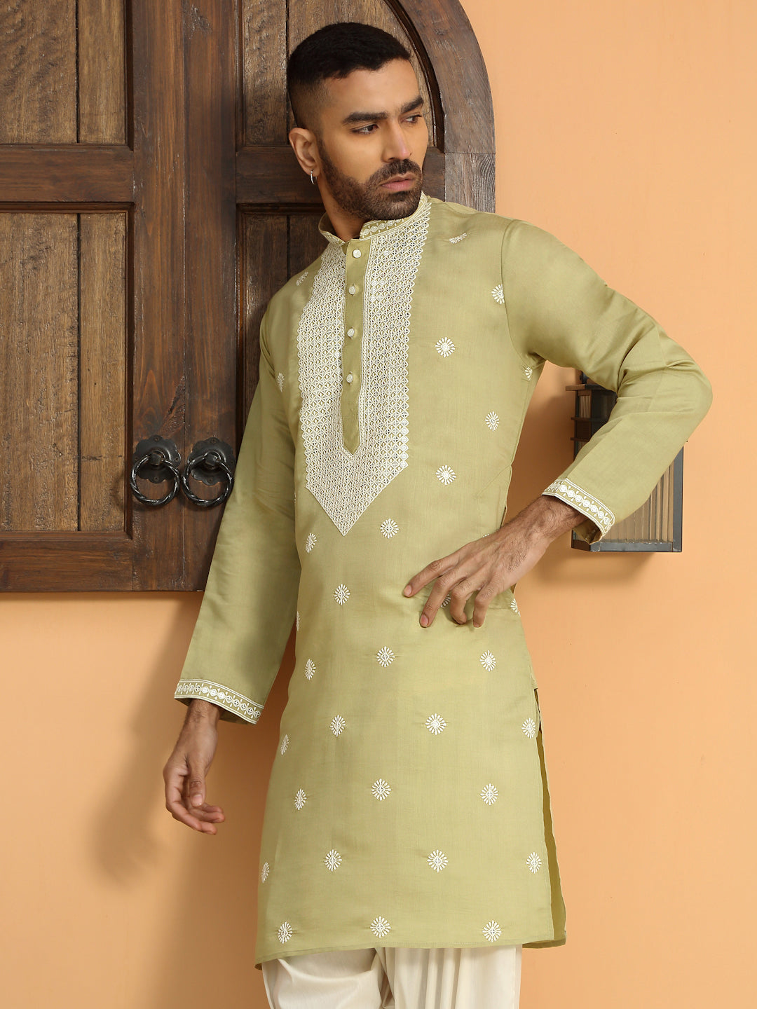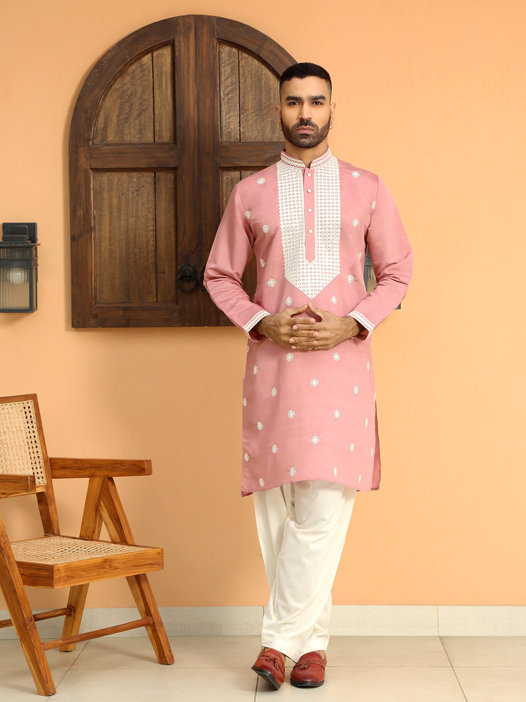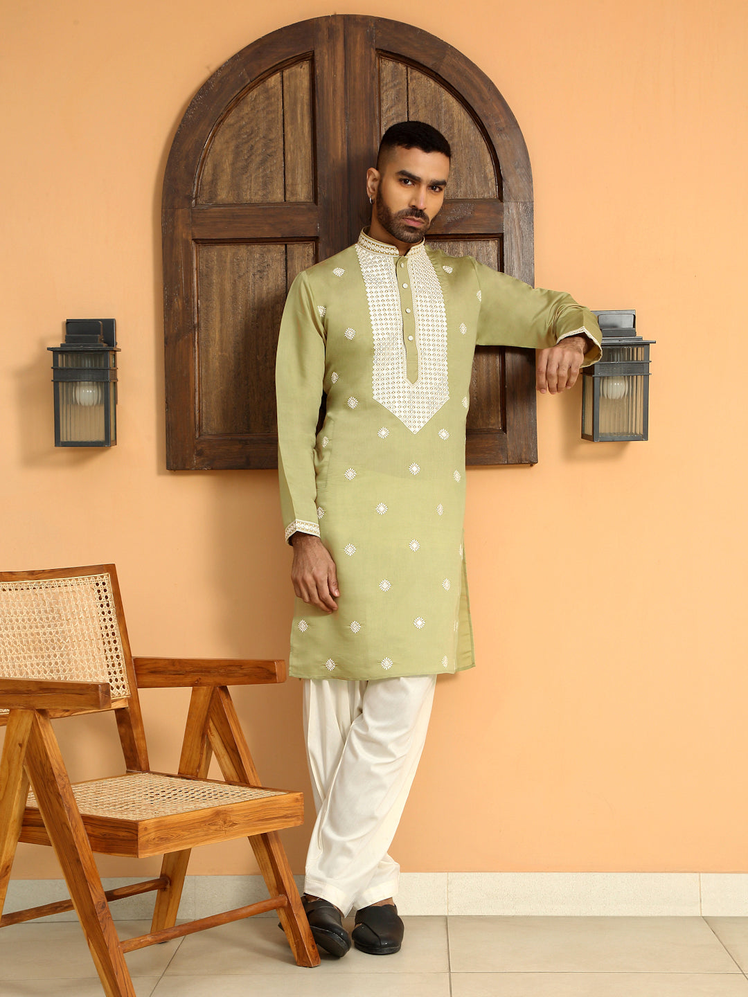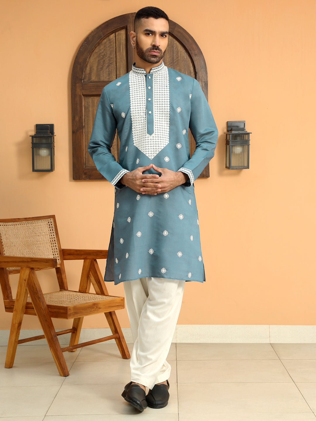 LUXE- Men Cotton Embroidered Sequenced Pathani Kurta with White Salwar set