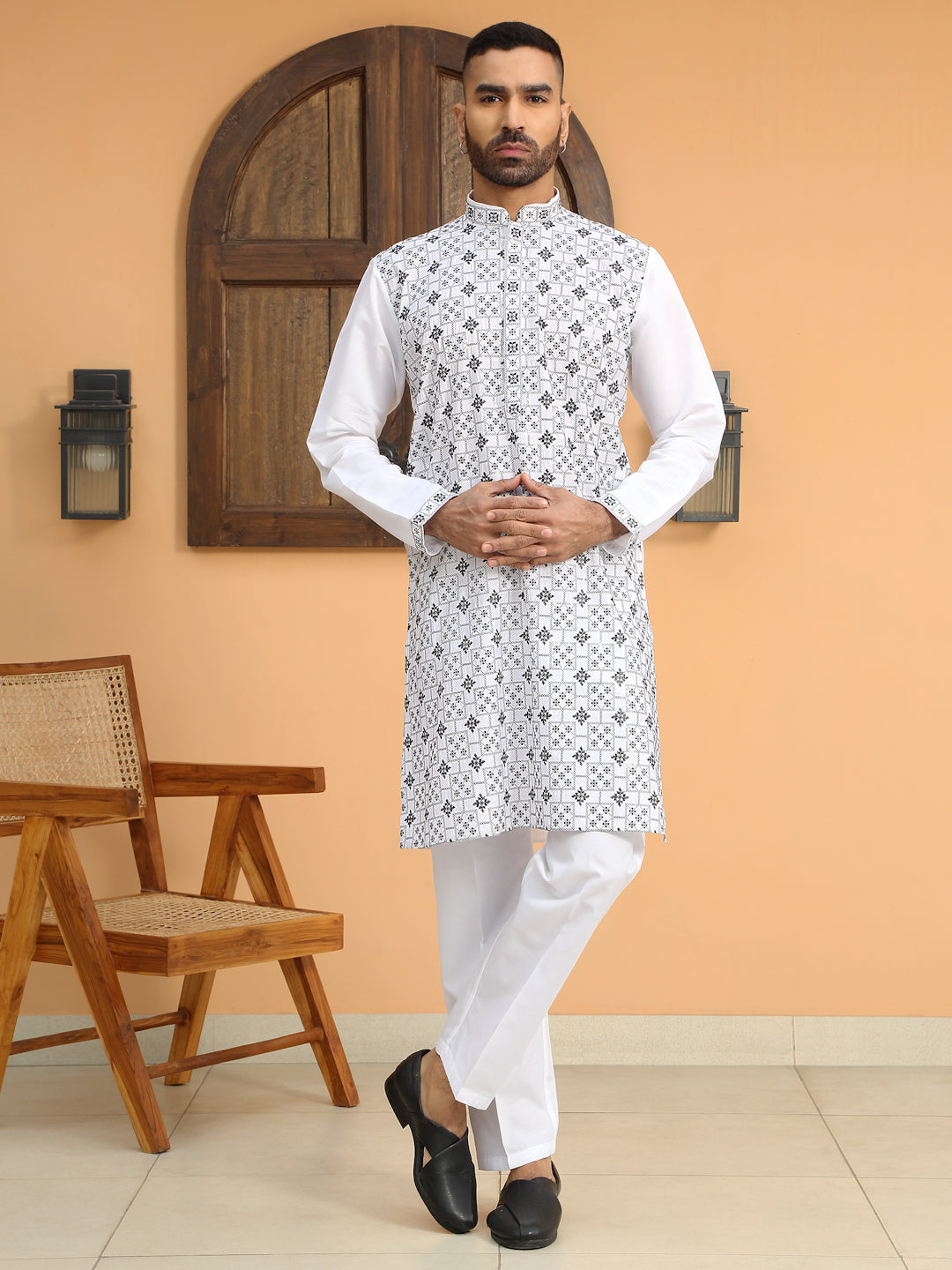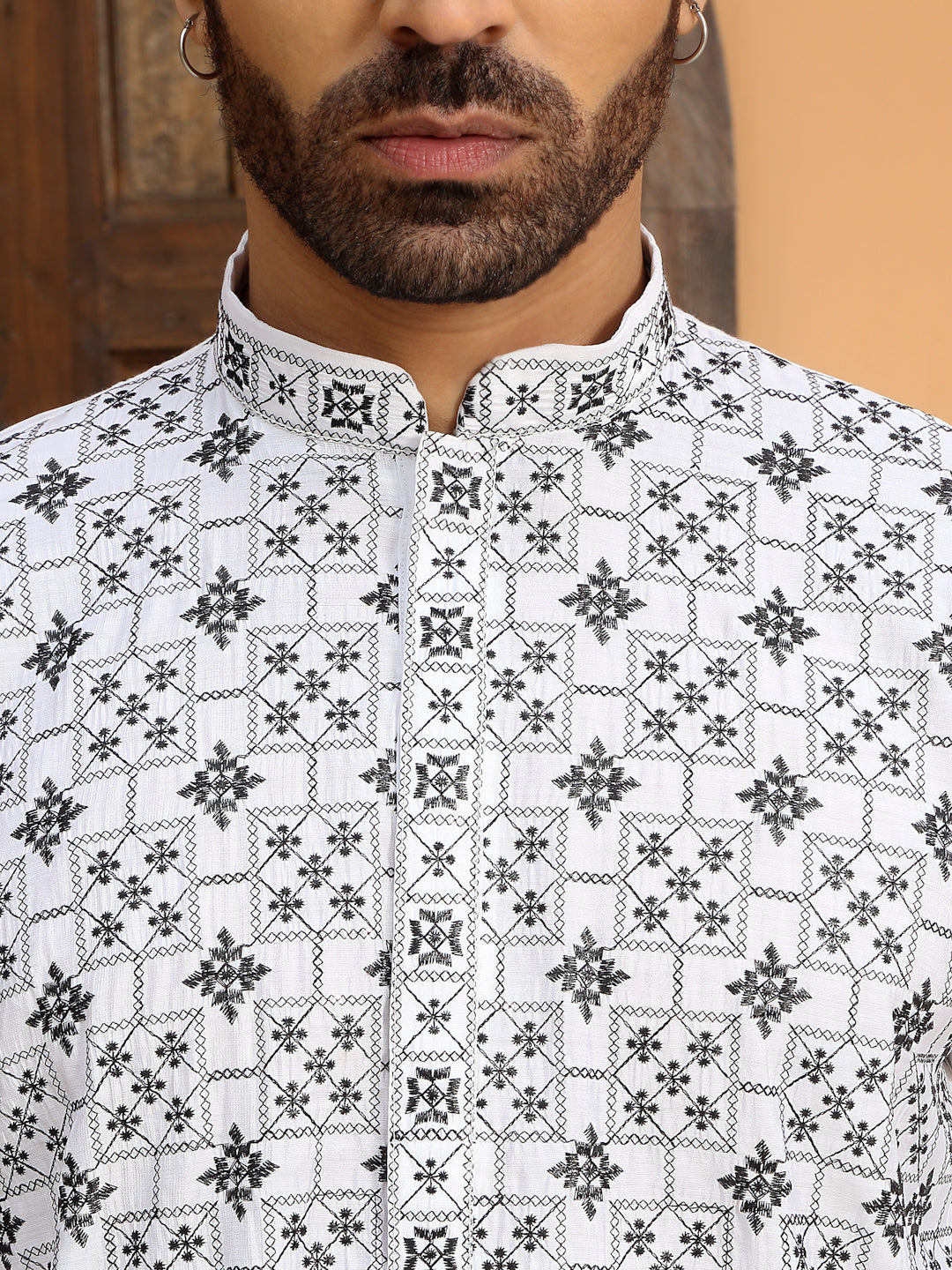 LUXE- Silk Geometric White Embroidery Kurta With Cotton White Trouser Pant