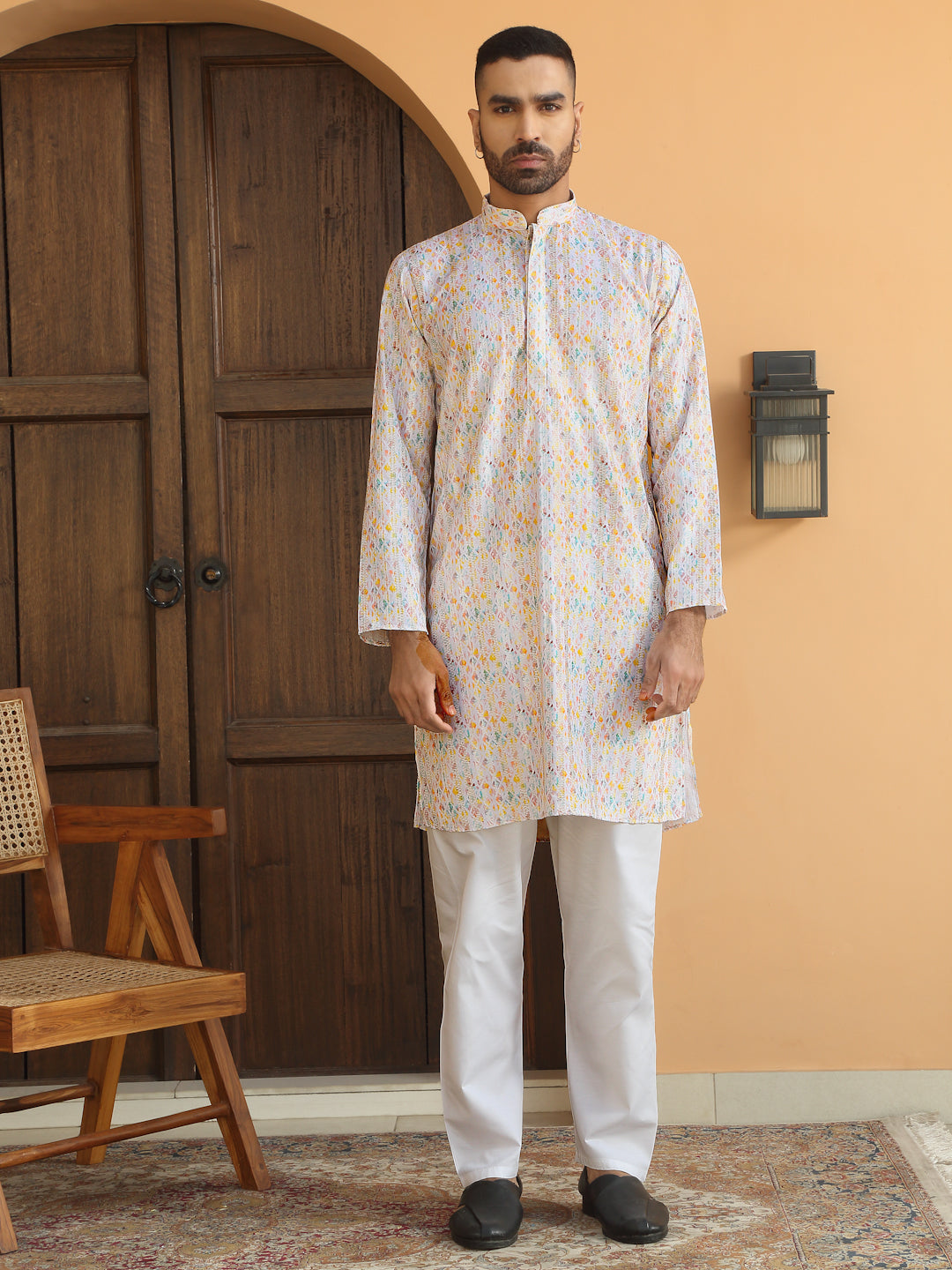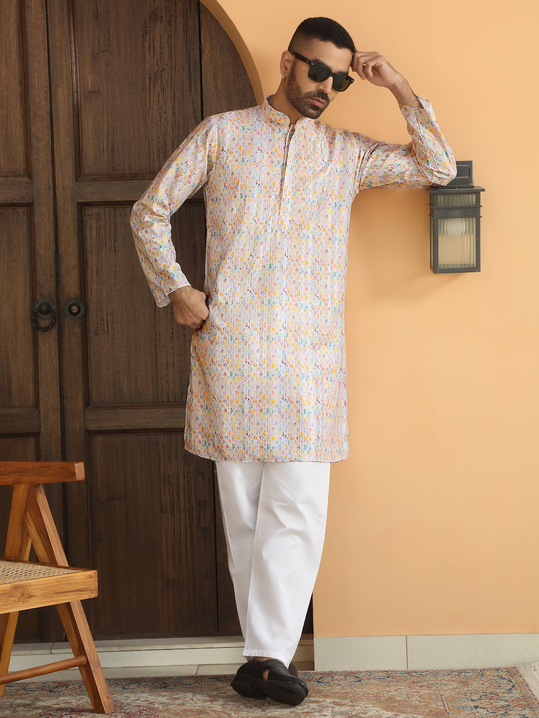 Floral Printed Geometric Cotton Blend Straight Kurta With White Elastic Waistband Pyjama Set