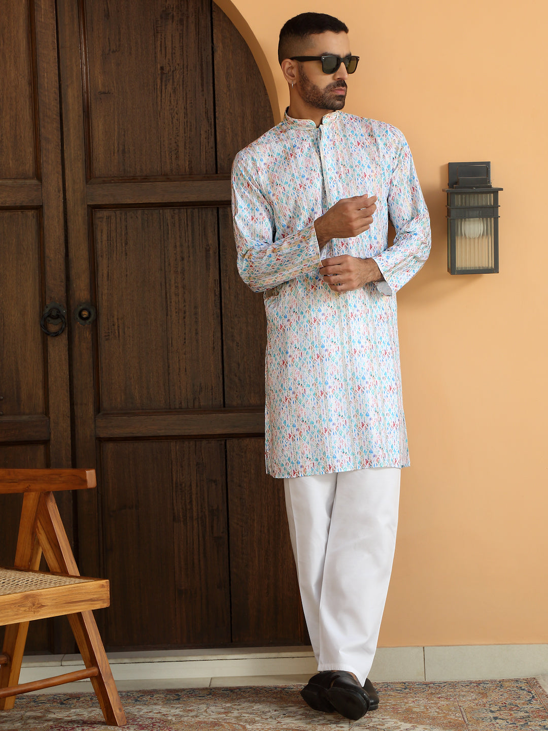 Geometric Print Straight Beige Blue Kurta with Contrast Blue Piping on Collar and white Elastic waistband Pyjama set