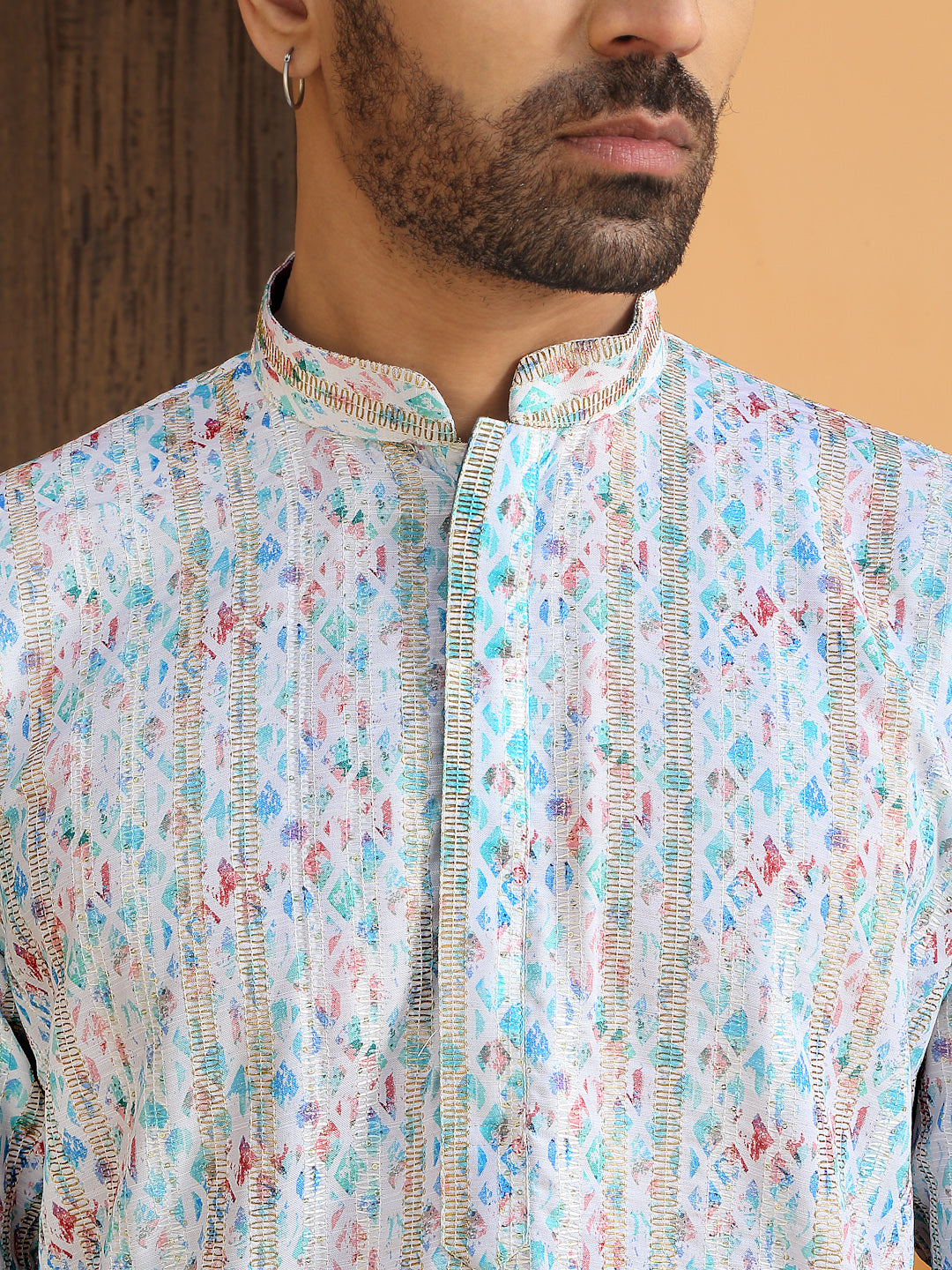 KRAFT INDIA Men Beige Silk Kurta Churidar With Blue Printed Nehru Jacket