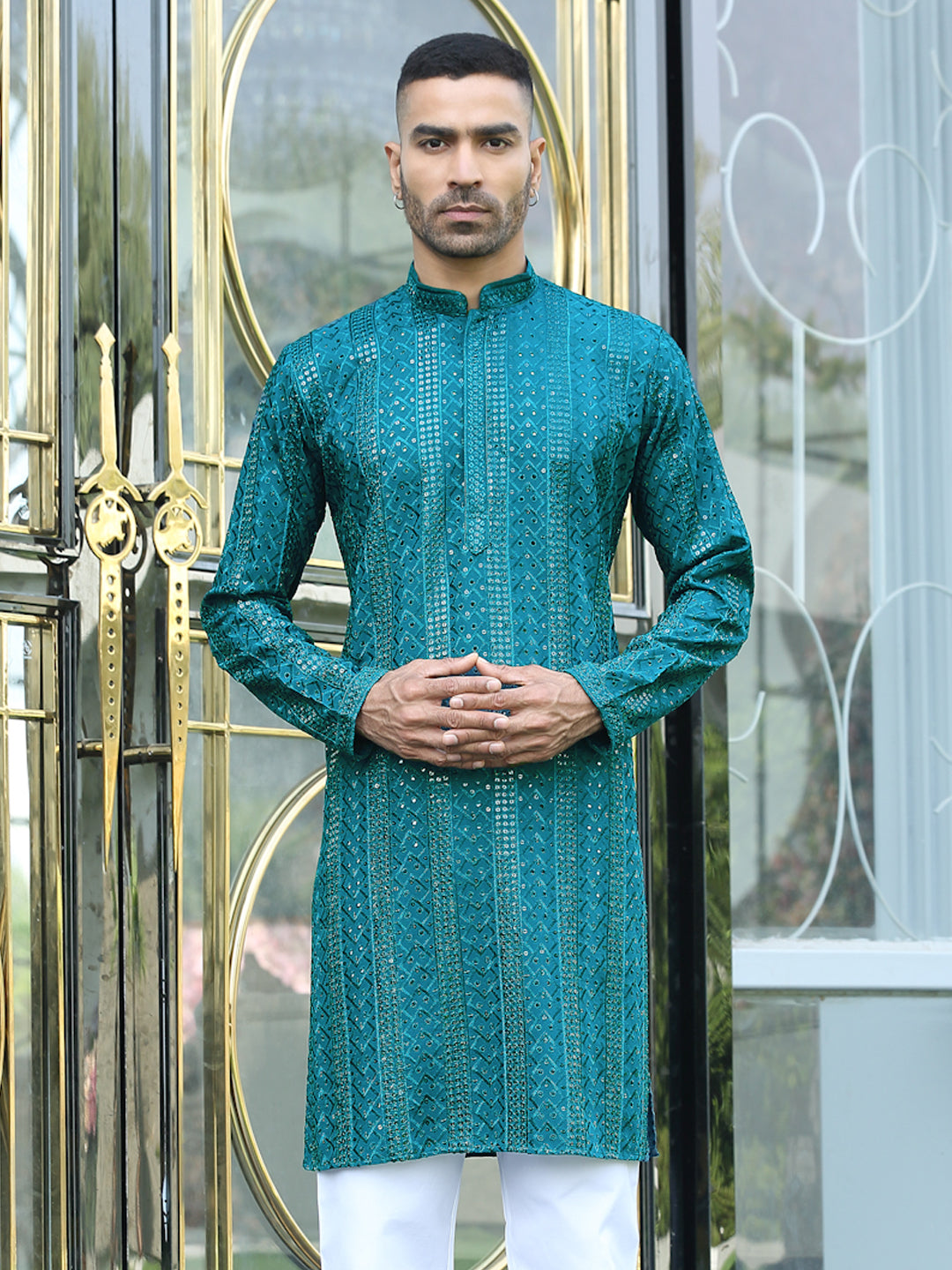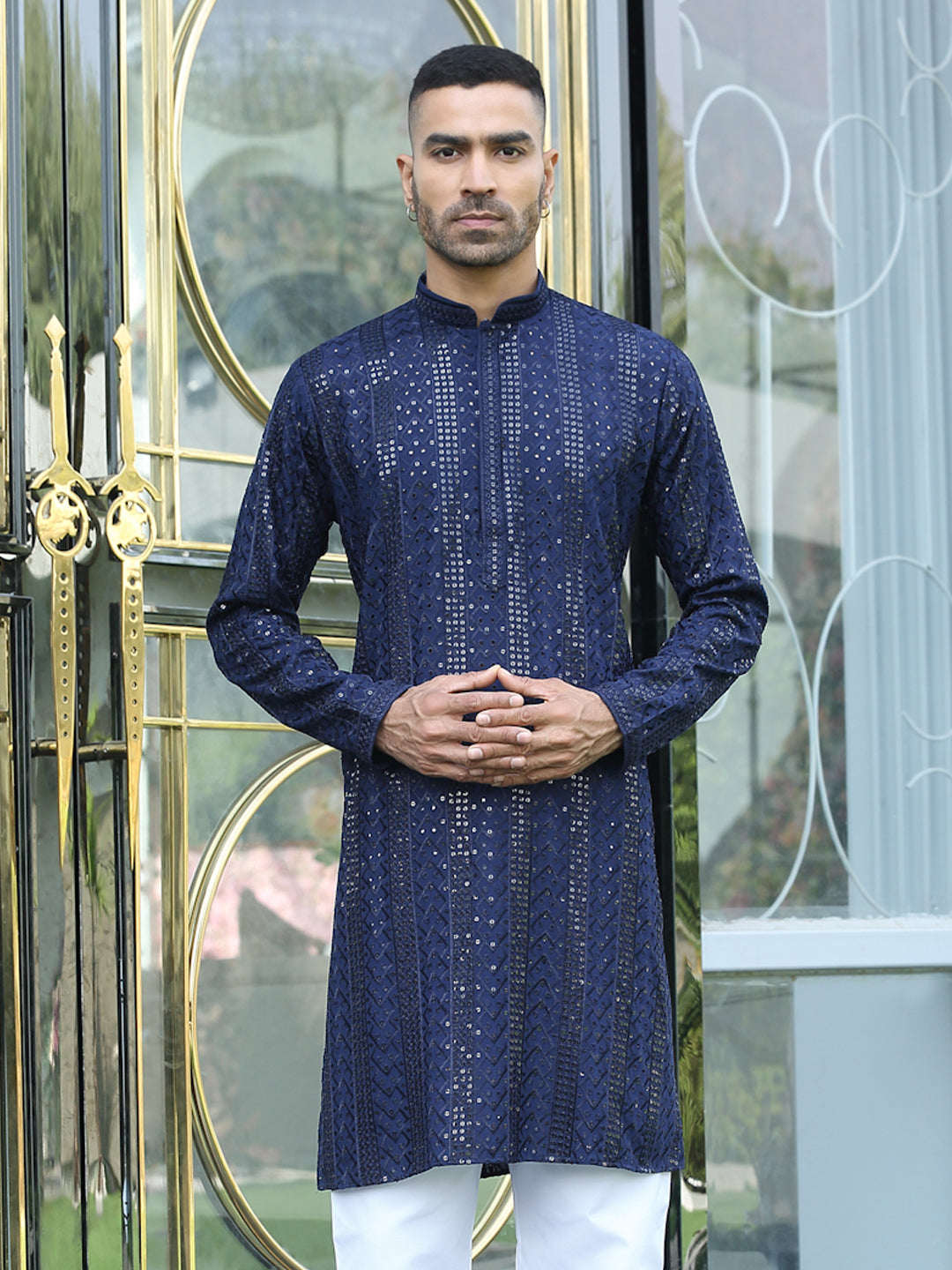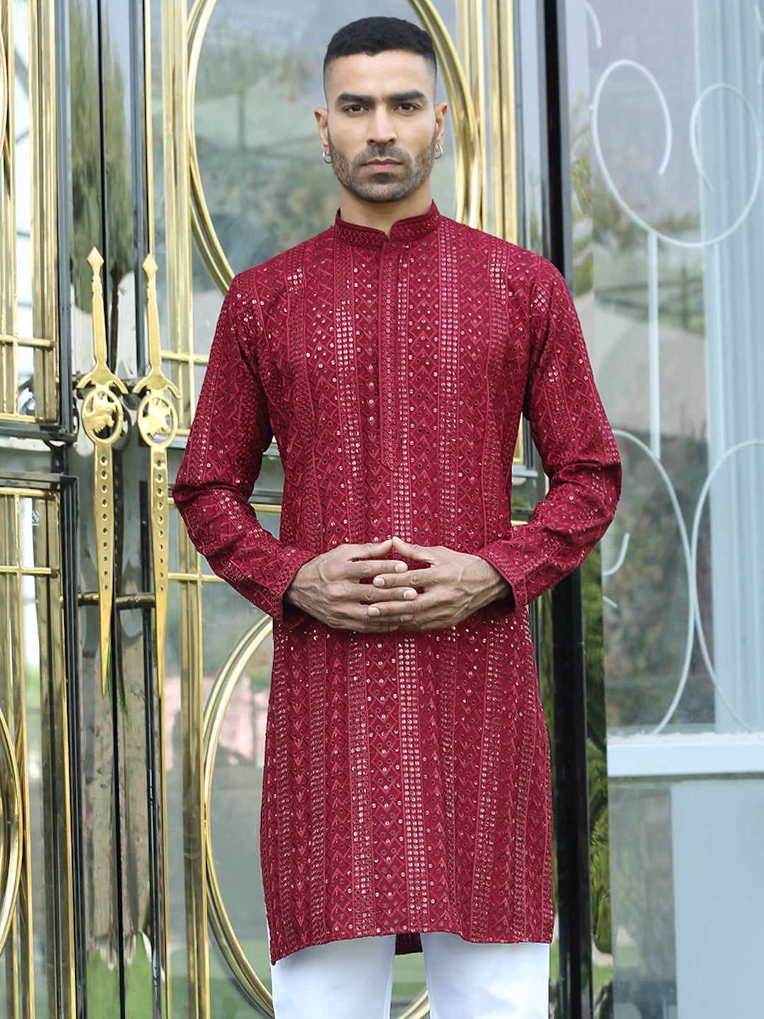Silk Rayon Ethnic Motifs Embroidered Mandarin Collar Sequinned Kurta