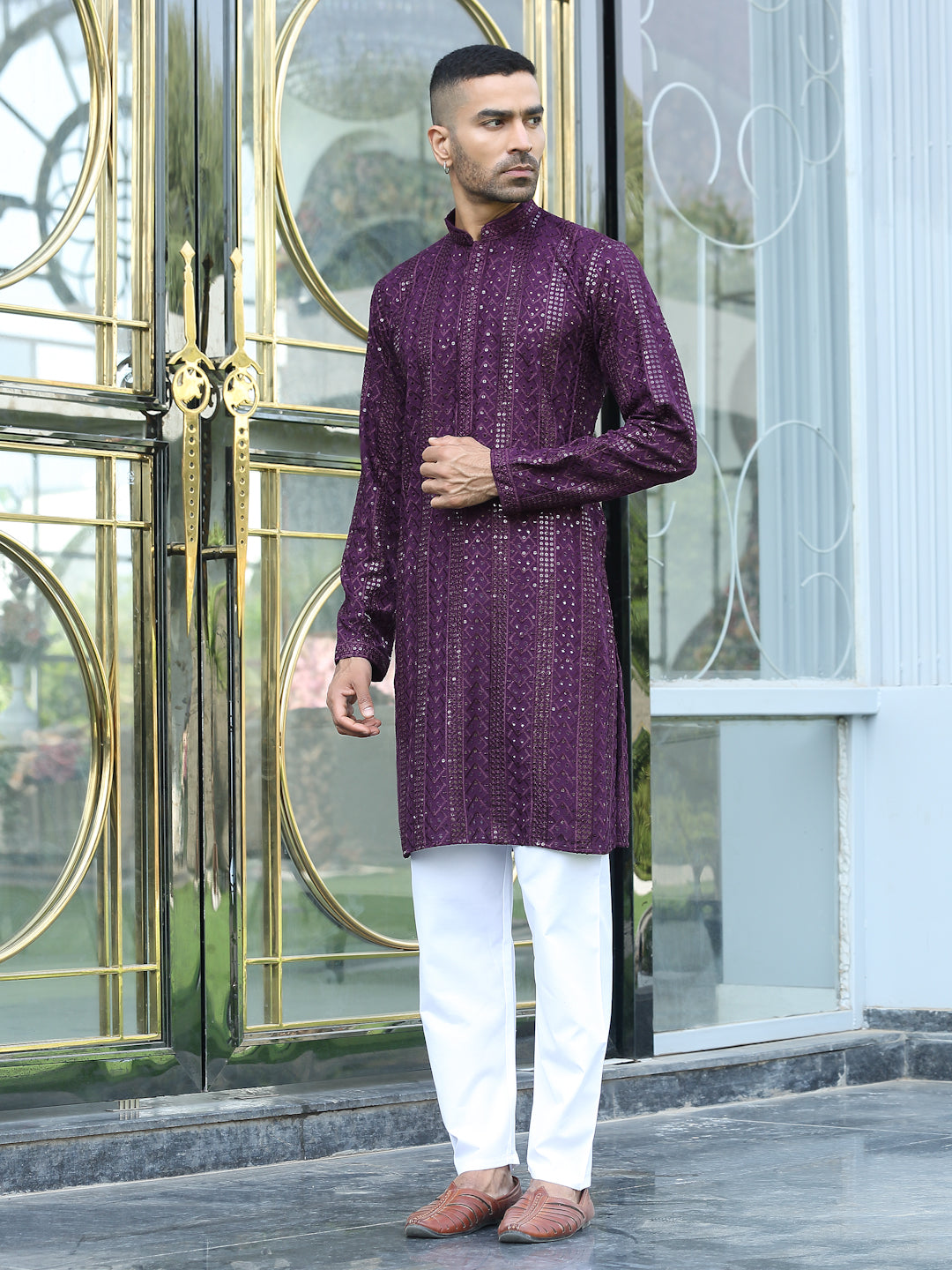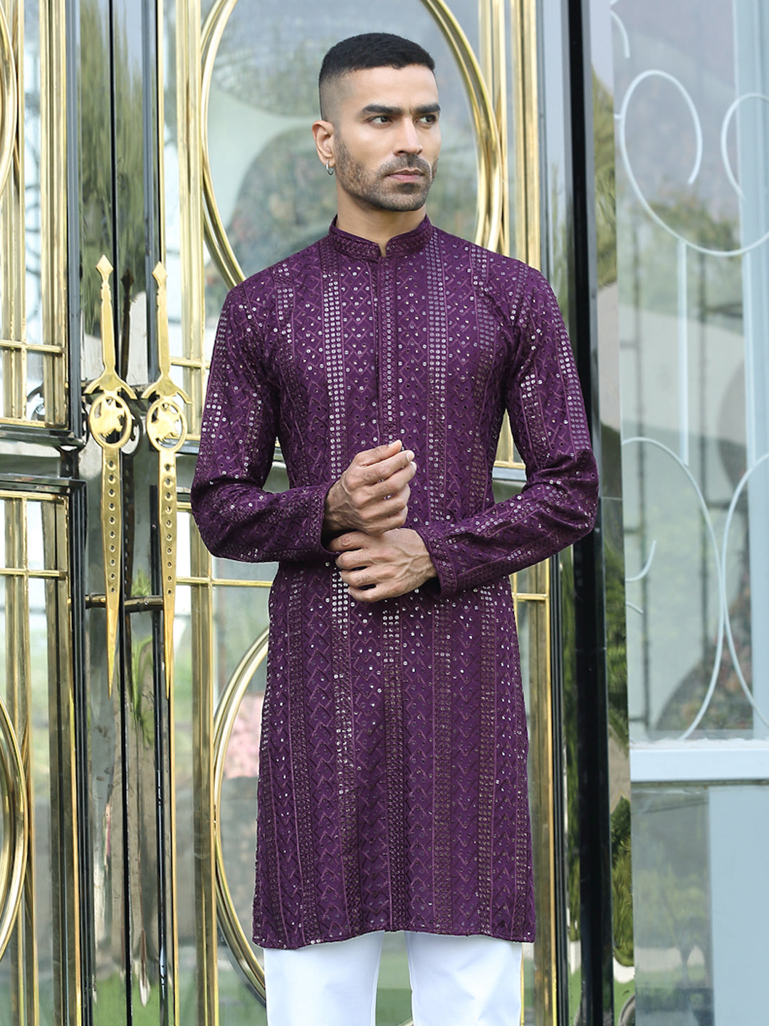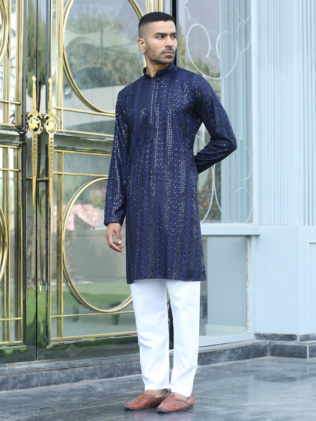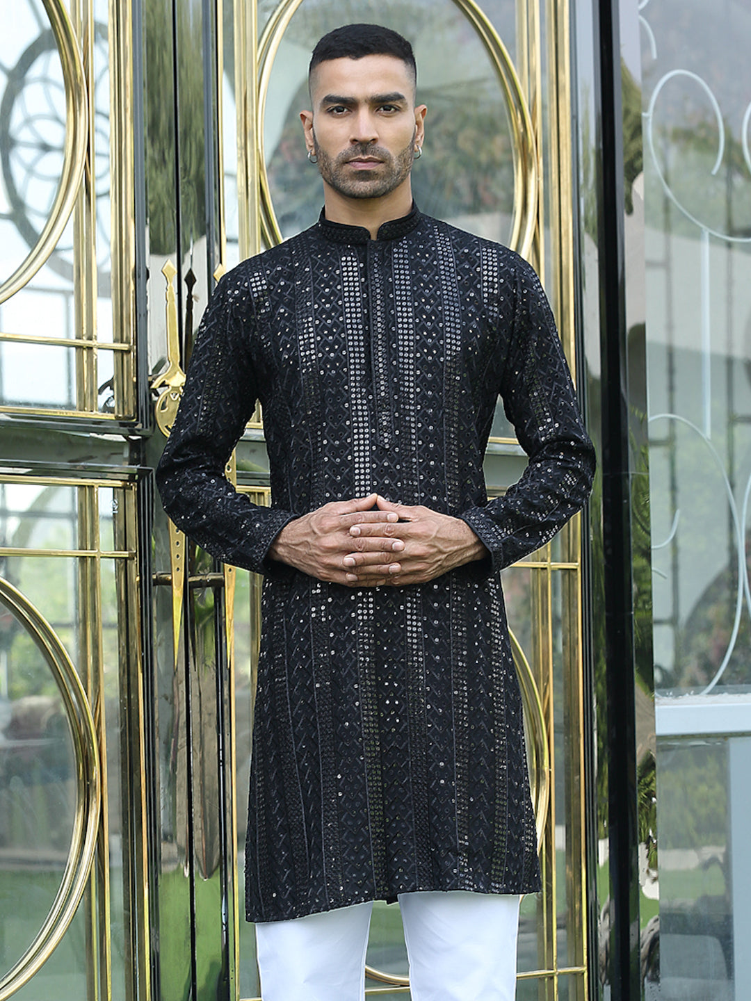 Silk Rayon Ethnic Motifs Embroidered Mandarin Collar Sequinned Kurta