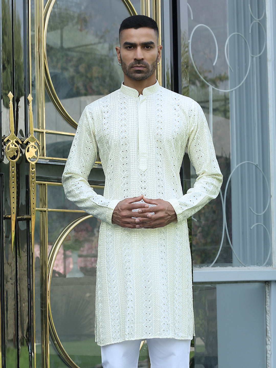 Silk Rayon Ethnic Motifs Embroidered Mandarin Collar Sequinned Kurta with Elastic Waistband White Pyjama