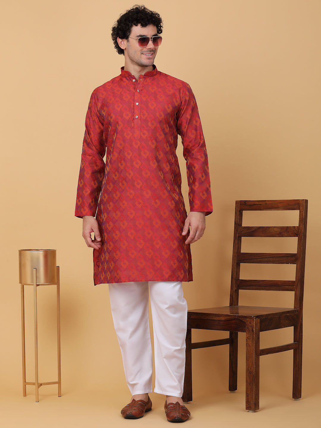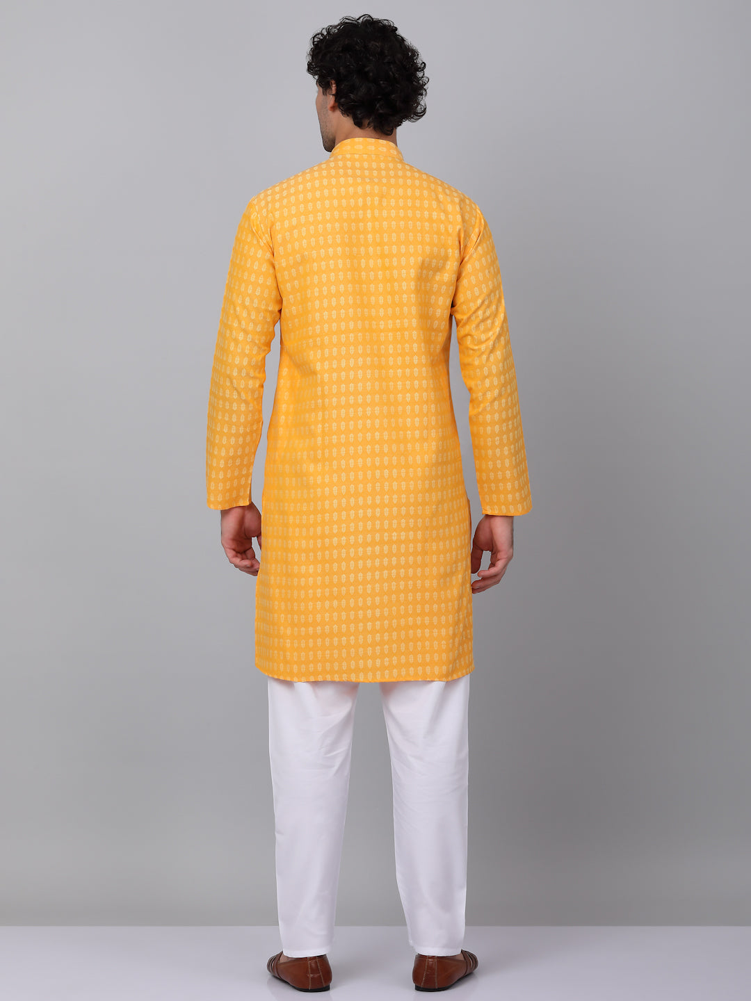 KRAFT INDIA Men Jacquard Knee Length Kurta With White Elastic Waistband Pyjama Set