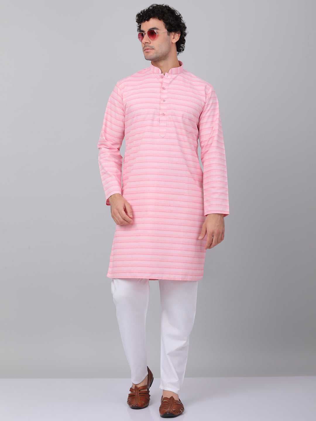 KRAFT INDIA Men Pure Cotton Striped Knee Length Kurta with White Elastic Waistband Pyjama Set