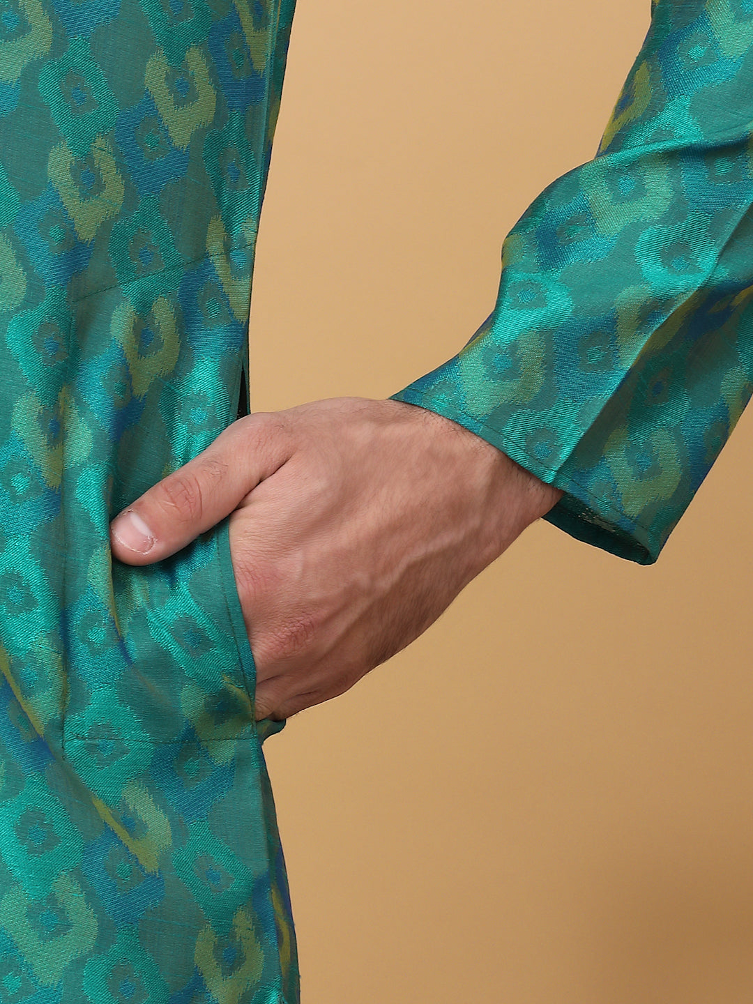 KRAFT INDIA Men Sea Green Silk Kurta Churidar With Blue Printed Nehru Jacket