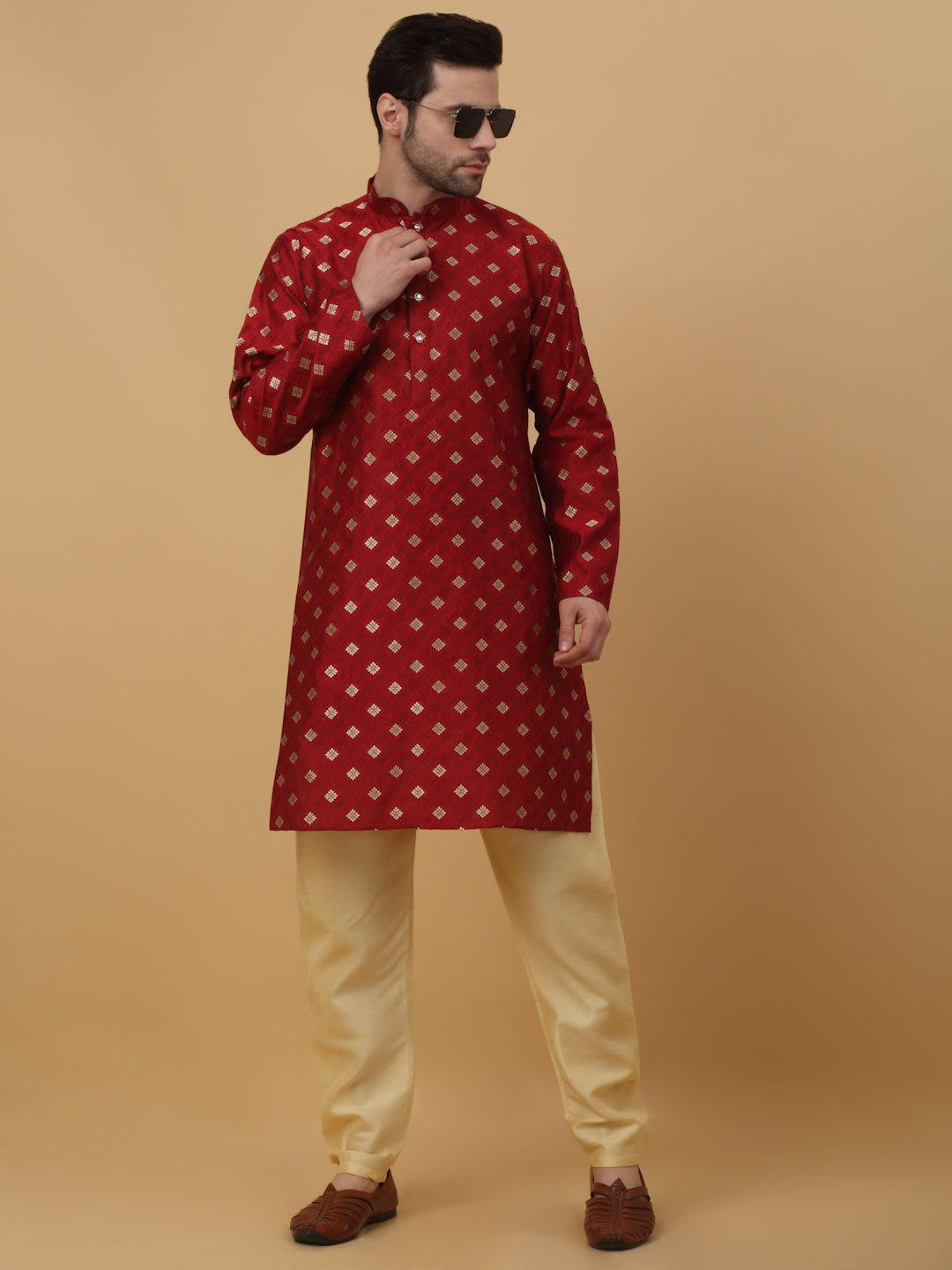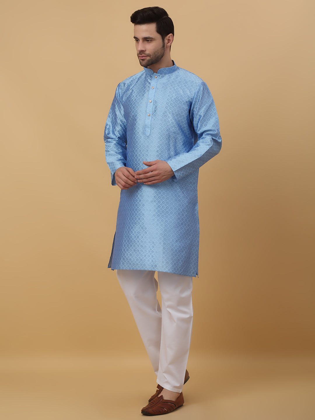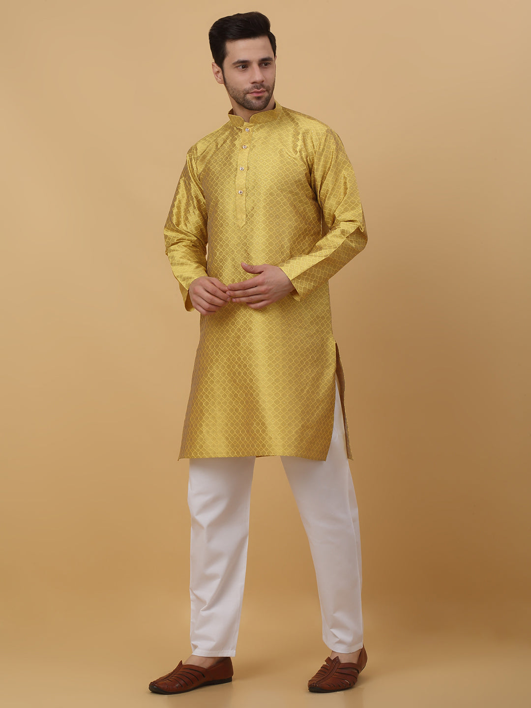KRAFT INDIA Men's Silk Blend Geometric Jacquard Kurta With White Elastic Waistband Pyjama Set