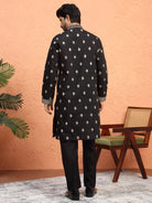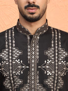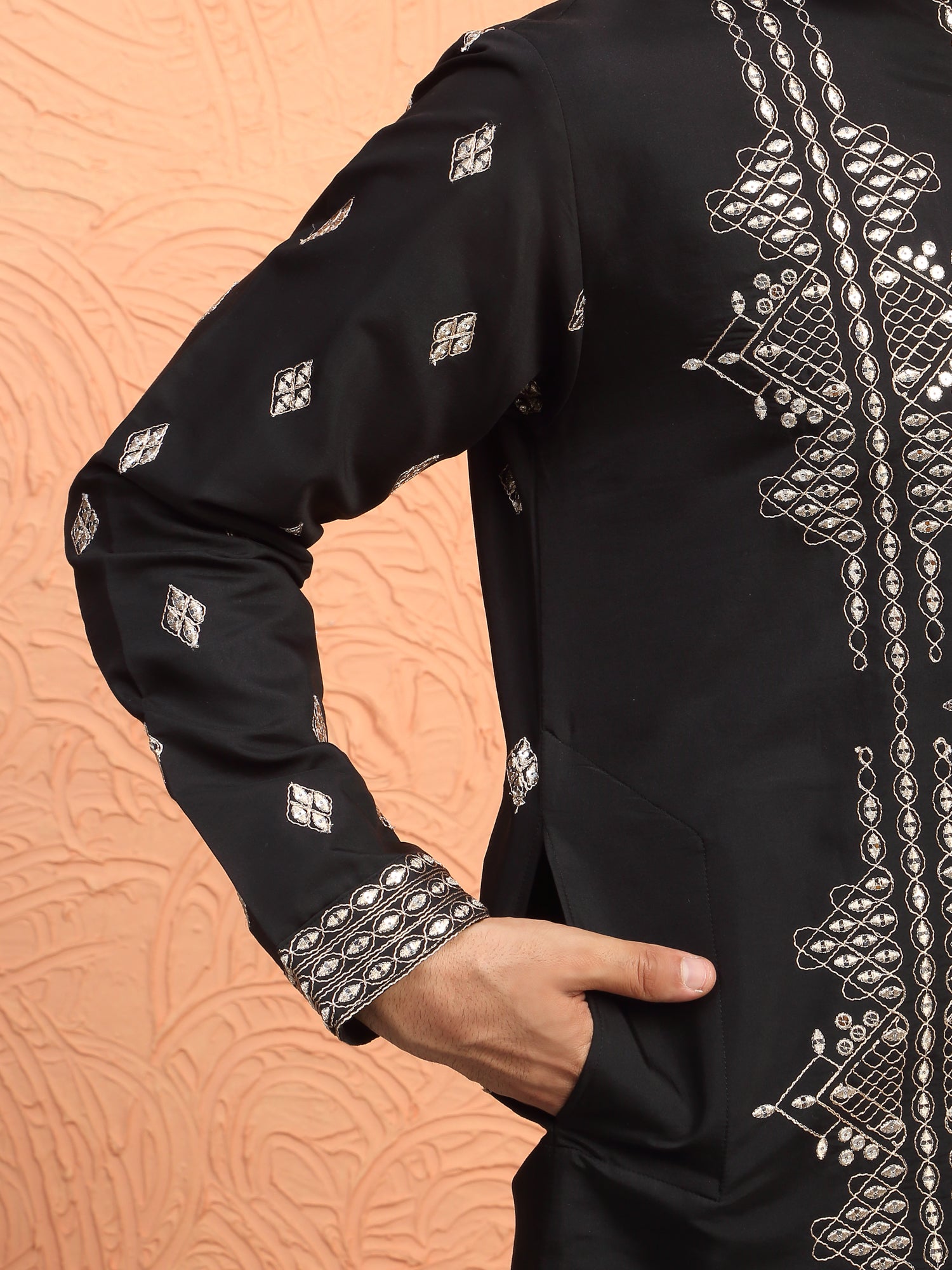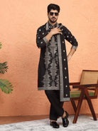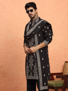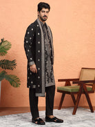 Step into refined elegance with this men’s cotton silk kurta set, designed for festive occasions and celebrations. Crafted from premium cotton silk, the kurta showcases exquisite zari sequined embroidery that adds a subtle shimmer. The long silhouette with a straight hem and button closure ensures a structured yet comfortable fit, while functional side pockets offer convenience. Paired with well-tailored trouser pants and a matching dupatta, this ensemble blends tradition with modern sophistication, making it perfect for weddings, parties, and cultural gatherings.