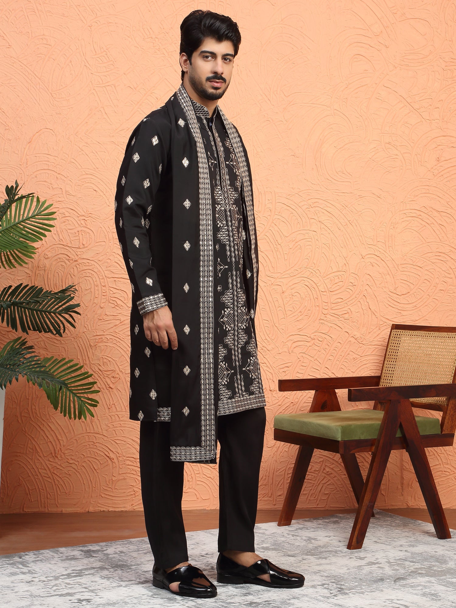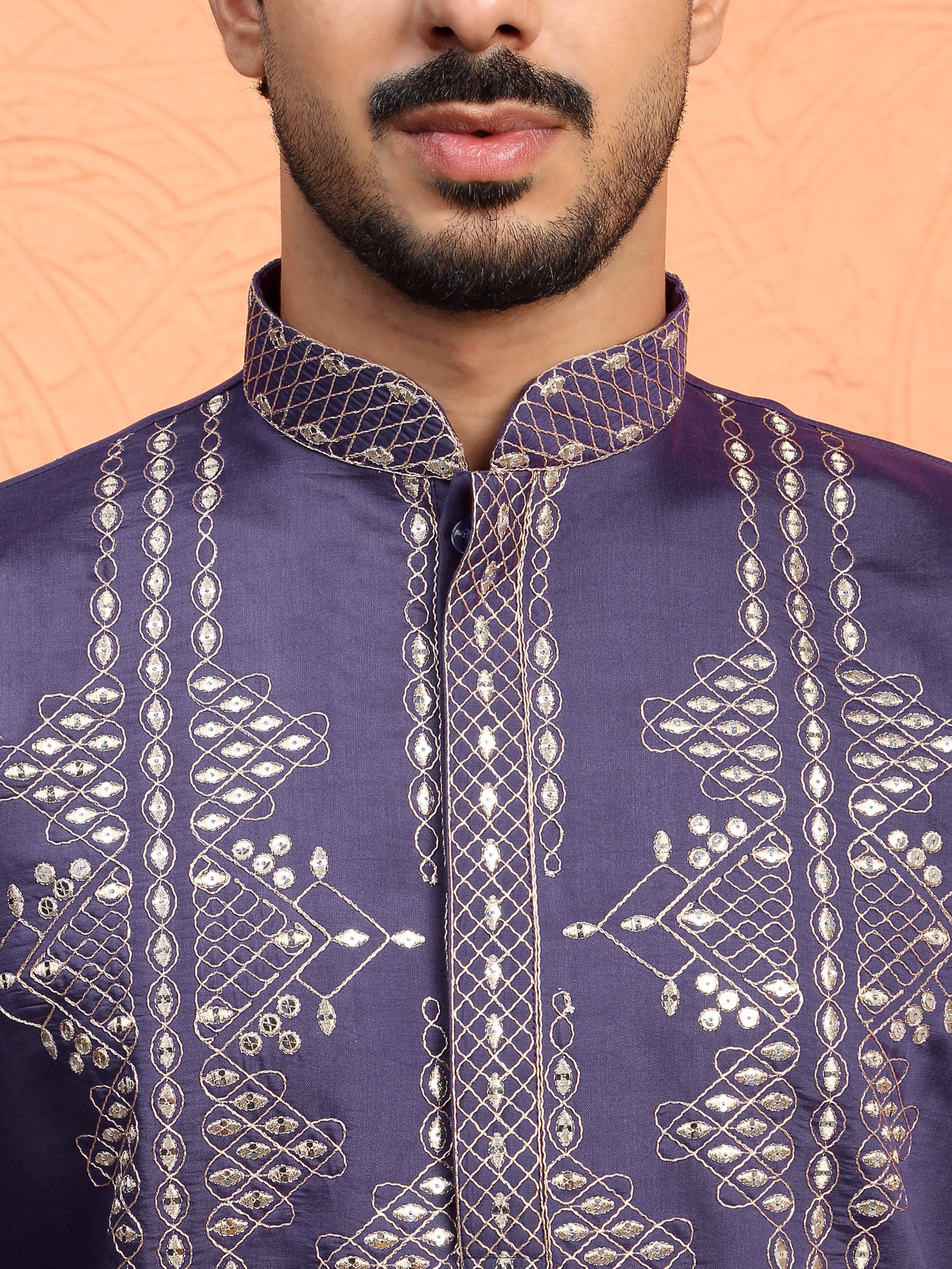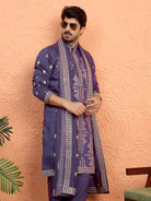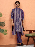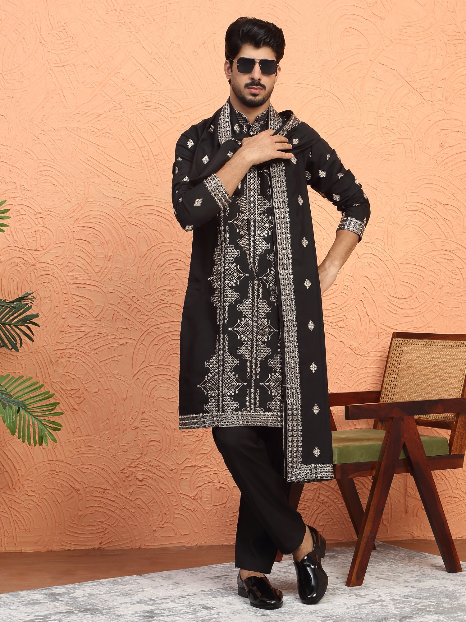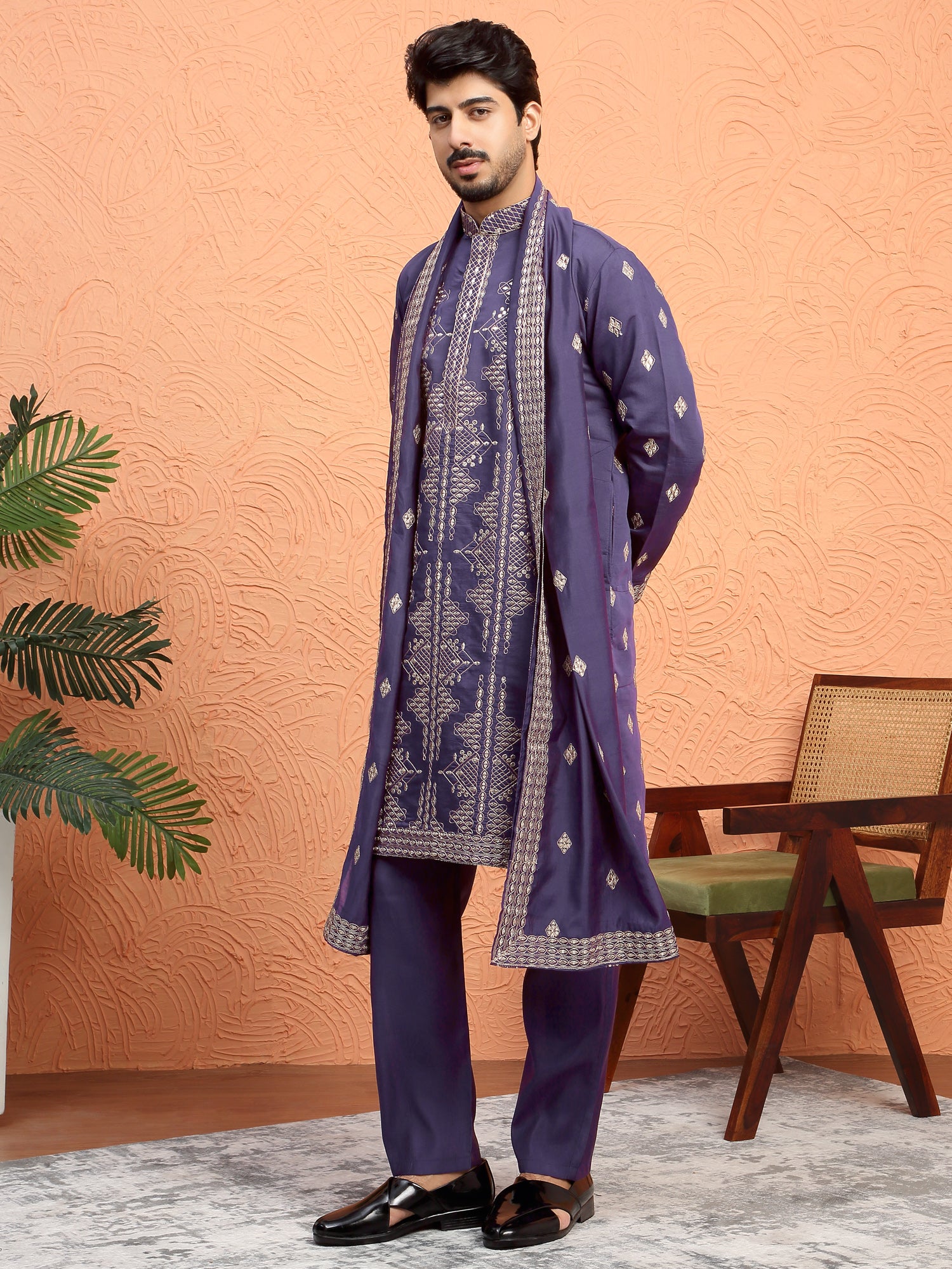 Men's Cotton Silk Zari Sequenced Embroidered Kurta Trouser Pant Set With Matching Dupatta