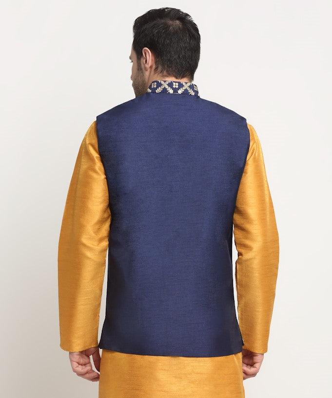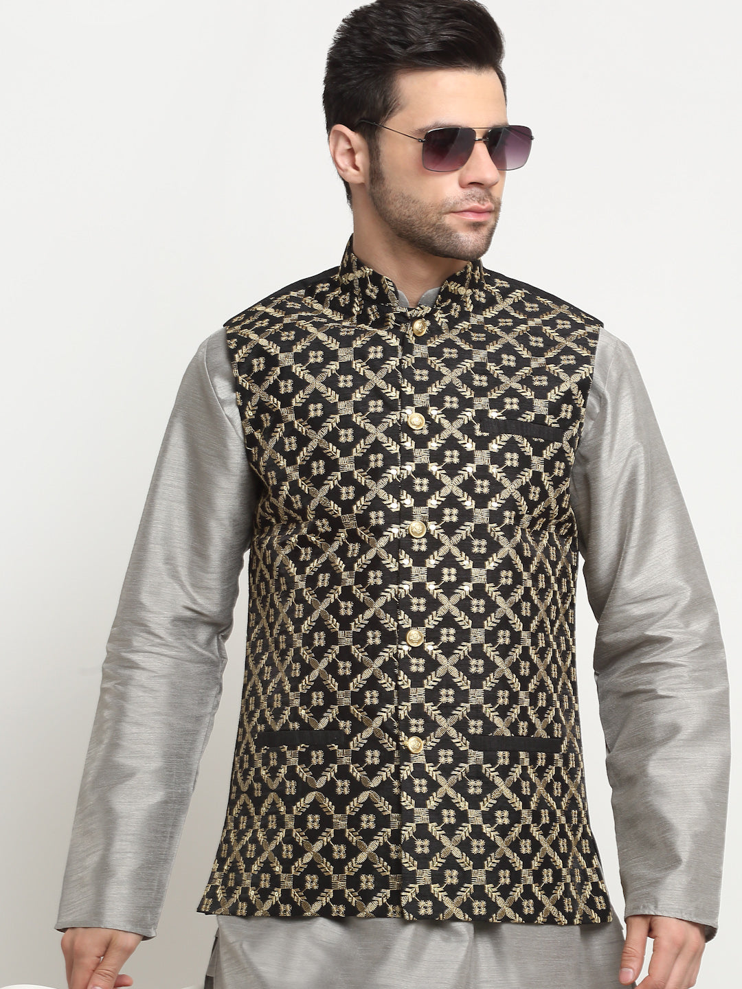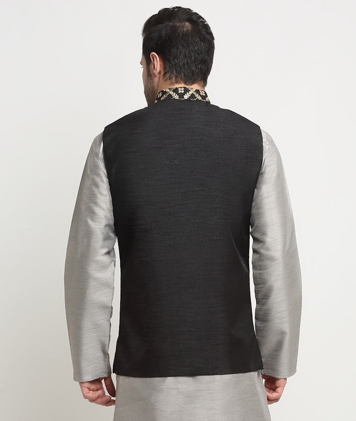 The Embroided Silk Nehru jacket, has a mandarin collar, sleeveless, button closure, three pockets, and an attached lining.